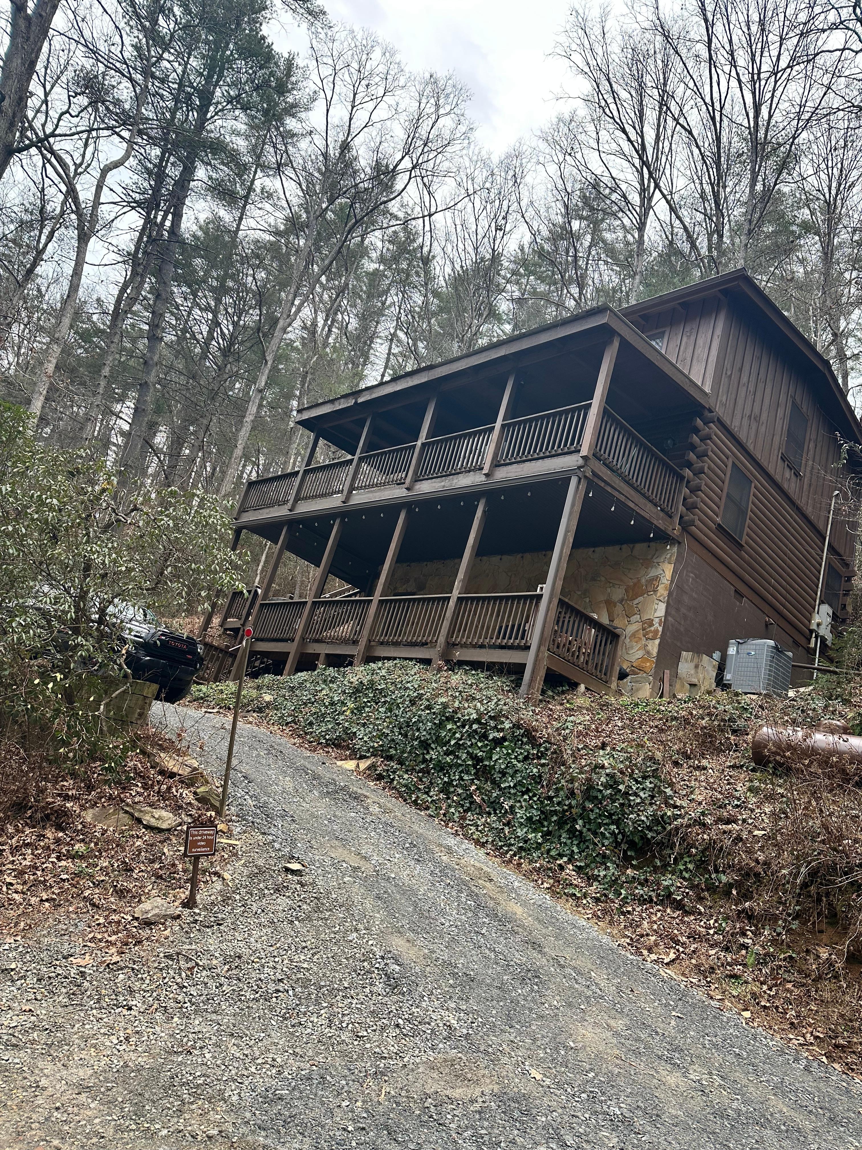 Adult only as the cabin is not suited for children. There is an open staircase and loft inside the cabin as well as an upper outdoor deck approximately 20 feet off the ground. There are 31 outdoor steps up to main living level entrance from driveway. Outdoor video surveillance only. Cameras cover driveway, lower deck and steps leading up to cabin entrance door with lock box. Inside cabin and main seating area on upper deck are private and not in camera view.