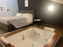 二人用のダブルベッドと床ジャグジーバスタブ付きのベッドルームゾーン。ダブル洗面台とバスタブ付きのバスルーム。クッキングゾーン、ダブルソファベッド、暖炉、スナックテーブル、55インチのスマートテレビを備えたリビングエリア。