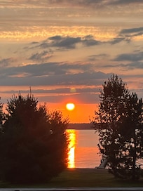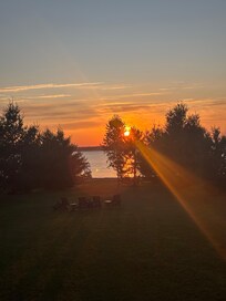 La propiedad de la cabaña tiene una playa de arena gradual, perfecto para los niños. Costa de arena y gran área cubierta de hierba para juegos de patio. Hay un pozo de fuego para asar malvaviscos. Segunda historia cubierta con vistas al lago con magníficas puestas de sol a través del lago durante todo el verano.