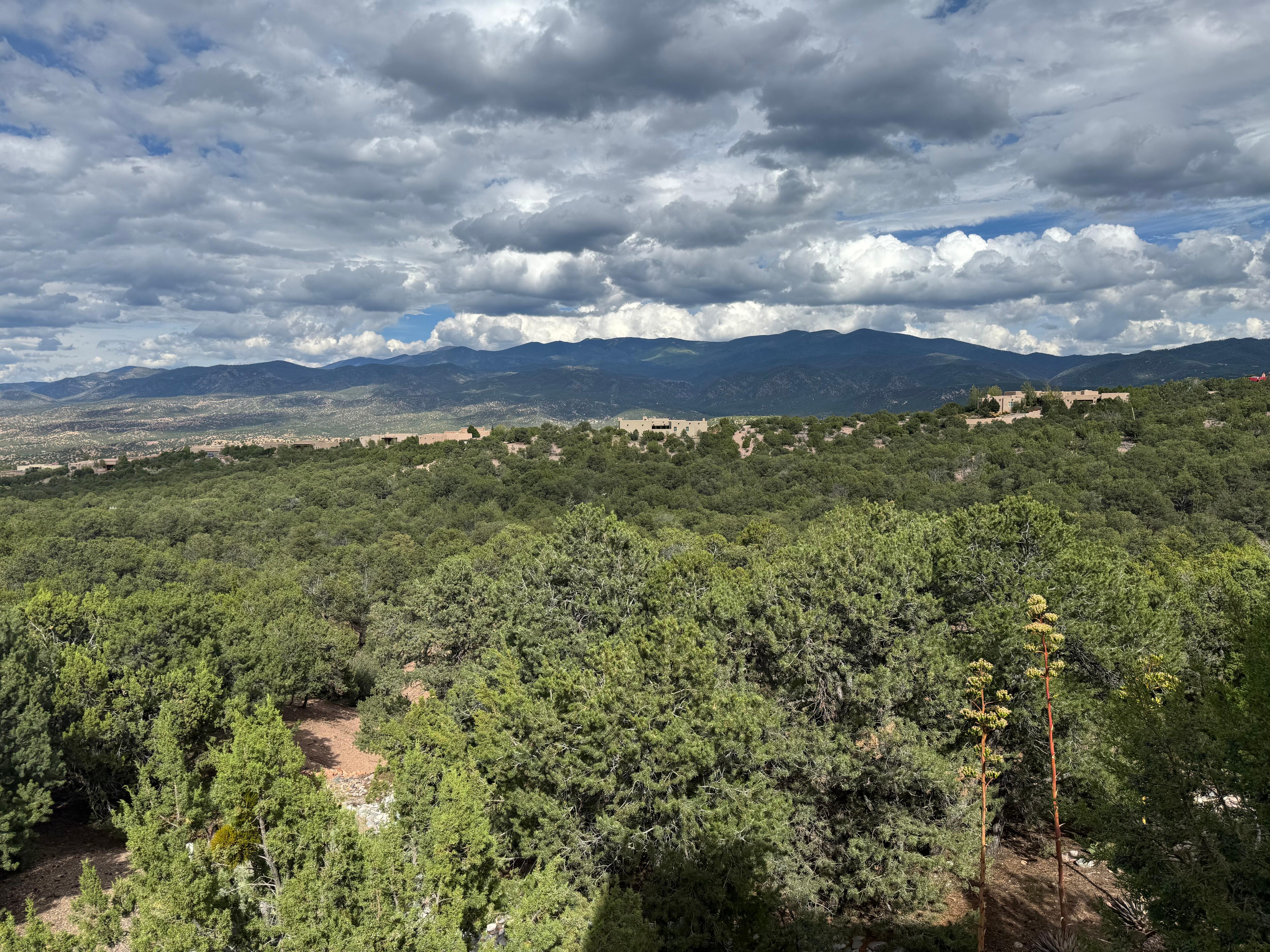 Sited on 2 private acres on a mesa overlooking the Sangre de Cristos mountains, this 5,400 sq ft home is filled with numerous New Mexican style touches. Intimate enough for a couple yet spacious and functionally designed for a group or family, highlights include an open kitchen/dining/television area, an elegant living room, a roomy master suite, two additional comfortable bedrooms with private baths, and a well equipped exercise room. Gas fireplaces in several rooms create additional warmth and festivity. All of this opens to lovely gardens in the front entrance courtyard and to a spacious east facing portal with dining and lounging areas, gas grill and a six person hot tub. Soothingly cool plaster walls, heated stone flooring, classic beam ceilings, and handsome finishes accentuate each room, creating a magical, relaxed, and unaffected ambiance. Plentiful windows and skylights create a gorgeous natural glow within and allow for appreciation of the marvelous surroundings and breathtaking views. The property is located behind a private security gate in a quiet area just outside the City of Santa Fe limits, very near the Santa Fe Opera house. The central plaza in Santa Fe is less than a ten minute drive from the house.
