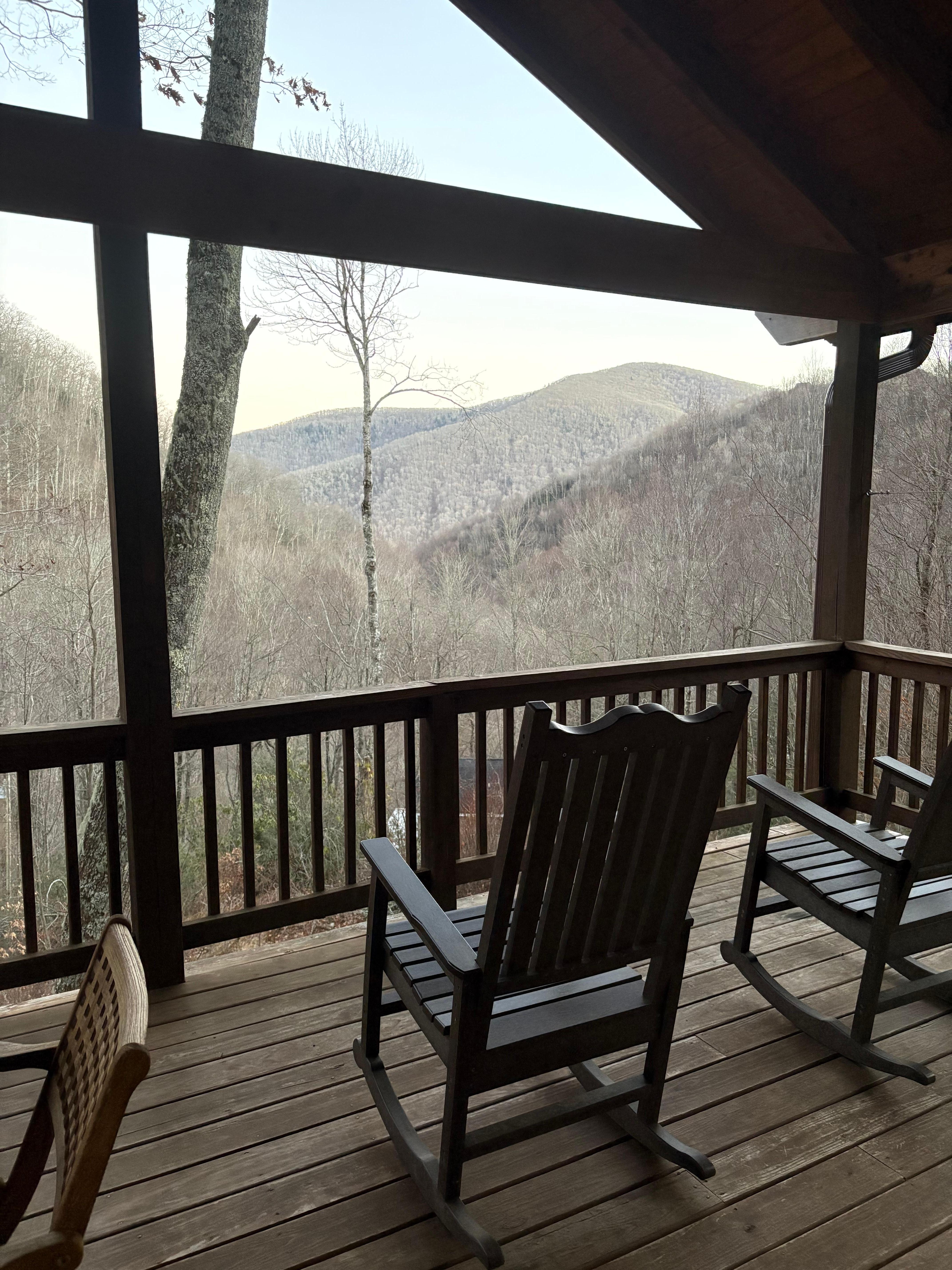 Take in long-range mountain views of Plott Balsam from the grand covered porch, complete with comfortable outdoor seating.