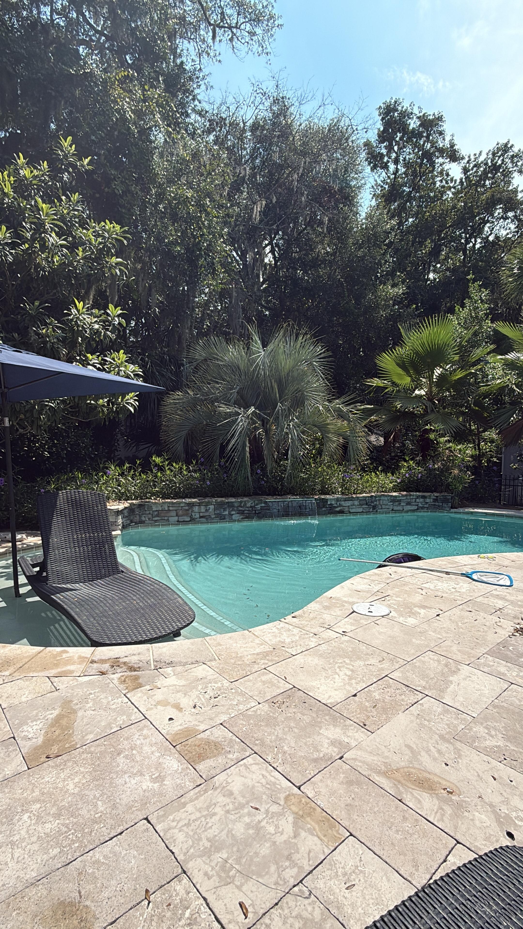 Outside there is a newer, private sunny pool with a cascading waterfall, the pool deck is large and done in stone, you will feel like you are at a private resort. There are five lounge chairs, an umbrella table for six, and a Weber gas grill. There is an incredible screened-in porch off the kitchen that has ceiling fans, a patio sofa, and two chairs making this the perfect place to relax after a day in the sunshine poolside or at the beach.