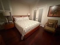 Two bedrooms upstairs one with a California King Bed and the other a queen bed, private baths for both. A small balcony from the Front bedroom with view of the fountain. The living room has a half bath.