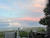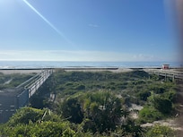 The second floor has the living area, kitchen, bathroom, entertainment nook, access to the second floor deck and bedroom #3 which has a queen size bedroom suit. The living room has a 72 inch high definition Samsung TV and sound bar. The second floor deck leads to the walk way to the beach. The walk way also includes an enclosed wooden shower with hot and cold running water - great for rinsing off after a long day on the beach!
