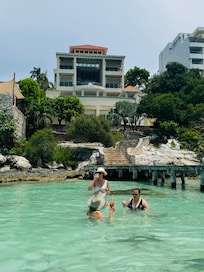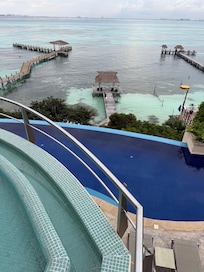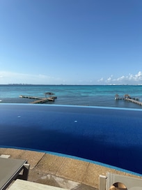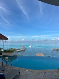 vistadelaluz.com, "View of the Lights," is an extraordinary 6 bedroom, 9 bath modern villa designed by renowned architect Michael Piazza. This magnificent villa overlooks and has direct access to the turquoise waters of the Mexican Caribbean. Bedroom suites have private terraces and spa bathrooms, each with a grand view of the turquoise Caribbean. A gourmet kitchen and spacious living area encompass the bottom floor of the main villa opening onto a 17 meter suspended pool with its water flowing over an infinity edge, seemingly into the Caribbean below. A separate pool house lies beneath the pool with access to the water by a private dock with covered palapa. This oceanfront villa will surpass all your vacation expectations!