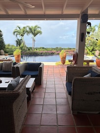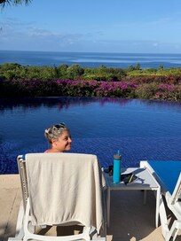The infinity pool is always a lovely temperature with panoramic sea views. The house is elevated on the ridge and there is often a refreshing light breeze which keeps you cool . The front of the property has electric gates with a wall around the property which is secure .