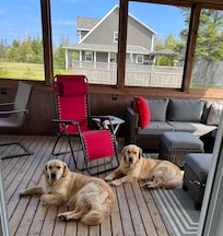 Off the kitchen is a large screened in porch, equipped with a dining table and chairs, as well as a cozy sitting area for socializing, reading or enjoying your morning coffee.