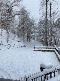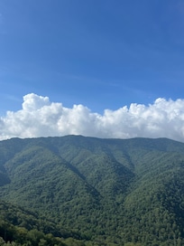 You will enter a private driveway to a large flat concrete parking area with just five steps to enter the cabin. The main level offers a beautiful rock fireplace accented with a log mantel, electric fireplace, leather sofa and two leather chairs. The living area features a 40" LED TV with ROKU and Spectrum Cable and as well as high speed internet throughout the cabin. All three master suites are on their own floor, so you have complete privacy. The kitchen is fully equipped, has large beautiful windows and doors that lead out to one of the three decks to enjoy the mountain air, inspiring views of the Smoky Mountains and Gatlinburg below. The deck is equipped with rocking chairs and a 6-person hot tub to enjoy the outdoors. Night time is another treat when the view turns to the glow of the city lights below.
