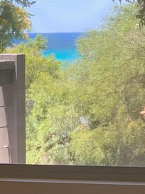 The upstairs master bedroom is a private sanctuary featuring a king-sized bed, reverse cycle air-conditioning, and a beautifully renovated ensuite complete with a large soaking bath, separate shower, and toilet – all designed to take in the tranquil views through the trees to the ocean beyond. Two additional upstairs bedrooms share a Jack and Jill-style bathroom with a shower and toilet. One has a queen bed and stunning treetop ocean views, while the other offers two single beds and looks out over the leafy backyard.