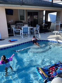 Our 28' x 14' Pool is South Facing, enjoying day long sunshine and a stunning lake view. We have just resurfaced the pool, added a safety bar, a tropical rock waterfall and expanded the entire pool area. The larger of the two lanais is a perfect place for alfresco dining under the cooling breeze of the ceiling fan and enjoying the sound of the feature fountain. Enjoy an evening drink at your own Tiki Bar situated in the second lanai.