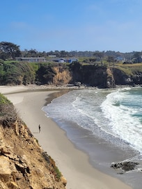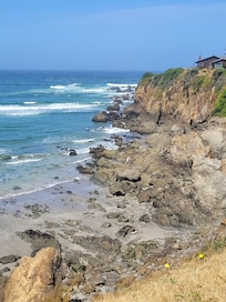 The floor-to-ceiling living & dining room windows gaze out to fabulous Hare Creek Bay where you can watch local surfers, birds & whales (Dec-Mar). Take a short walk to the beach - this is the only home in the area that has a deeded access to the beach via a spectacular brick stairway through a eucalyptus grove. Perched 30 feet above the bay, the southwest facing views take full advantage of sunlight throughout the year. Relax, refresh & reflect - 'A New World' awaits you!