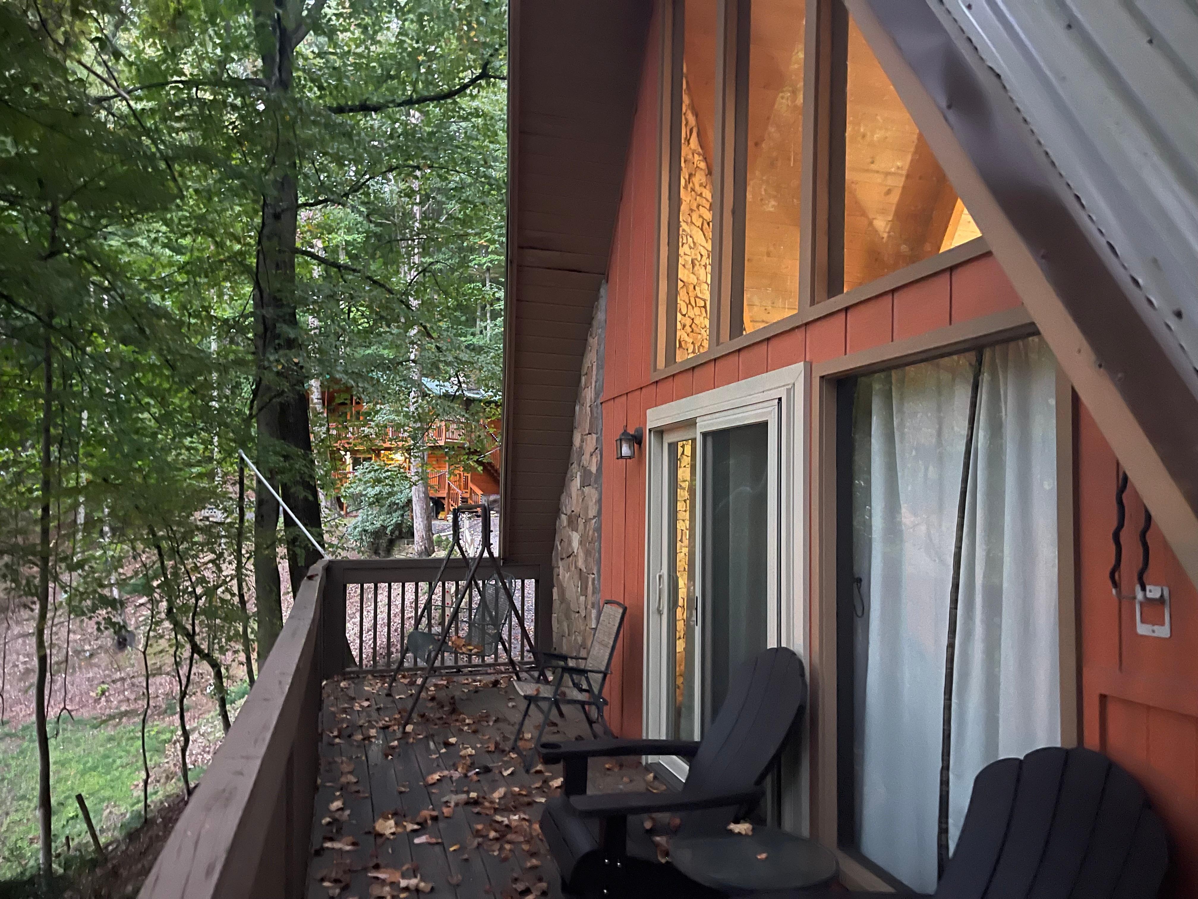 We love the tongue and groove paneling and the stone fireplaces. The deck is a nice place to relax under the shade of trees in the summer. While we have neighbors within sight, this is in an older section of Ski Mountains where the cabins are more spaced out.