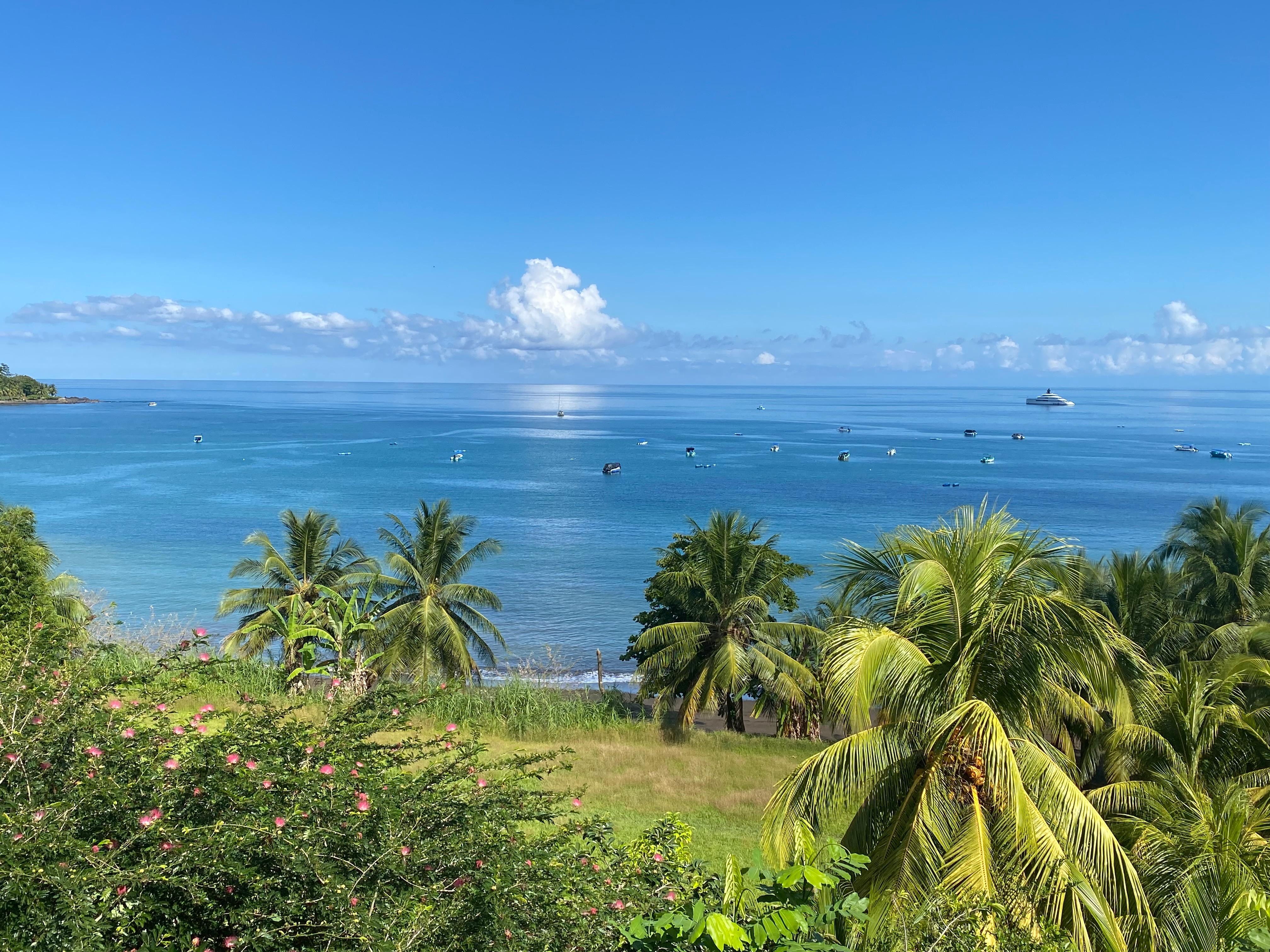 Villa de Osa is the finest rental house in the Drake Bay area. The yard is full of beautiful tropical flowers and trees.The back deck has an unobstructed, panoramic view of Drake Bay and the Pacific Ocean. The consistent breeze off the water keeps the home 10-15 degrees cooler than off water properties. Built on a small hillside, there are private steps from the house directly to the beach. The location is perfect with several restaurants, markets and shops all within a few minutes walk. A rental car is not necessary. There are also taxis and river taxis available.