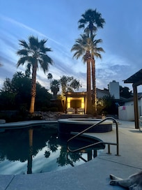 A great entertainer's paradise. Two desk areas if you need to work while vacationing. Extensive indoor and outdoor seating/lounging options. Excellent internet indoors, in the pool area and in the Casita. Huge double shower in the primary bedroom with two separate sink areas and a huge walk in closet. Check out the reflection of the palm trees in the pool each night! A lemon tree and two grapefruit trees on the property.