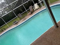 This is a Florida style, beautiful vacation home, fully furnished and beautifully maintained. With spacious rooms for relaxing, the home is located on a double lot, in a quiet neighborhood. Enjoy grilling out by the heated private pool, in the screened enclosure!