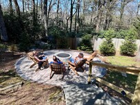board walls and stone front steps. Over time the steps have settled and became unsafe to use. So we repurposed the steps into a terraced flower garden and added a bird bath nearby. The covered & screened front porch is an outdoor space that can be enjoyed most of the year, rain or shine! We love the open floor plan and multiple gathering spaces inside and outside the house. Let the two sets of gas log fireplaces warm you on a chilly morning. Then build a roaring fire in the outdoor firepit in the evening to roast marshmallows. Soak in the Master Bedroom's large tub and slip into linen bedding to dream of tomorrow's adventures.