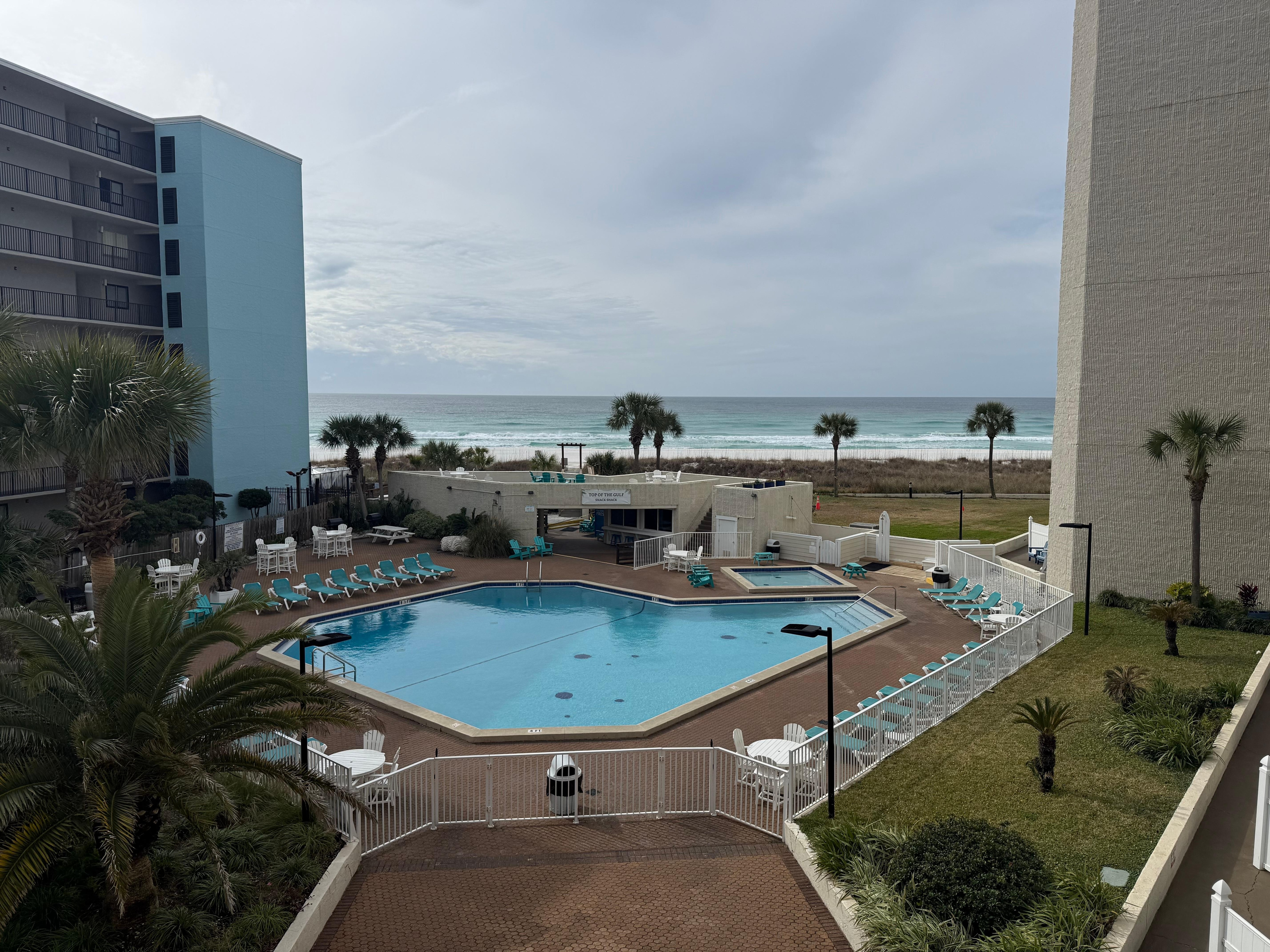 The resort features (2) gulf front pools (one full size, deep pool + one toddler pool) with showers, direct private beach access, shaded seating, sundeck, poolside snack bar, newly updated fitness center, sundry store, book exchange, lobby lounge, laundry facilities, vending machines, shuffleboard, corn hole, charcoal grills, BBQ picnic area, and game room with arcade and ping pong table.