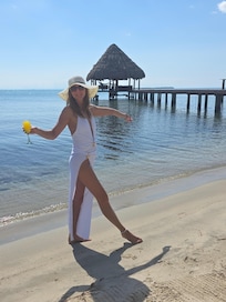 200ft pier with huge palapa. The palapa has a bar, sun loungers, seating , 2 swim platforms, 2 over water hammocks and another hammock on deck.