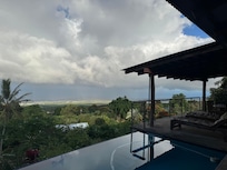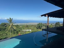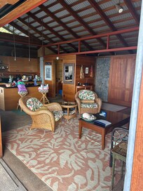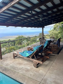 La casa de la granja tiene un amplio lanai cubierto y puertas corredizas de teca / vidrio entre la sala de estar y el lanai que se abren completamente al lanai con vistas despejadas de 180 grados del Océano Pacífico. Una piscina de agua salada de 4 pies de profundidad colinda con el lanai. No se calienta. En días nublados el agua estará fresca.