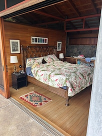 La casa de la granja está construida de madera Ohia molida a mano. Las puertas deslizantes son de teca. Los armarios de cocina son de bambú con encimeras de granito negro. El techo es de metal galvanizado y expuesto en el interior de la vivienda. El techo reproduce los techos de estaño corrugado que se ven en las antiguas chozas de café. La casa es exquisita en cada detalle. La habitación de la cama mira por encima de la piscina al jardín de café. Hay un ventilador de techo. La gran ventana / pared orientada al oeste da a la piscina y la vista.