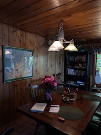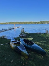 From the front deck we've seen turtles, otter, deer, grouse, and eagles. The shallow lake entry area is perfect for play. "Dark Skies" make this a fabulous place to watch for meteor showers and Northern Lights (we've seen both many times) The dock has room for your boat or make it your private fishing pier. Our area of the lake is popular with the fisherman who know the good spots.. Two kayaks and a canoe are included for a quiet morning paddle. Serve meals on the old-style pine picnic table and choose between charcoal grill or gas flat top, making outdoor cooking a pleasure. Retire to the oversize hammock to read a book or take a nap. When it's time to clean up head for the outdoor shower with dressing area. The perfect end to an upnorth day is around the campfire where stories are told and marshmallow S'mores are the traditional treat.