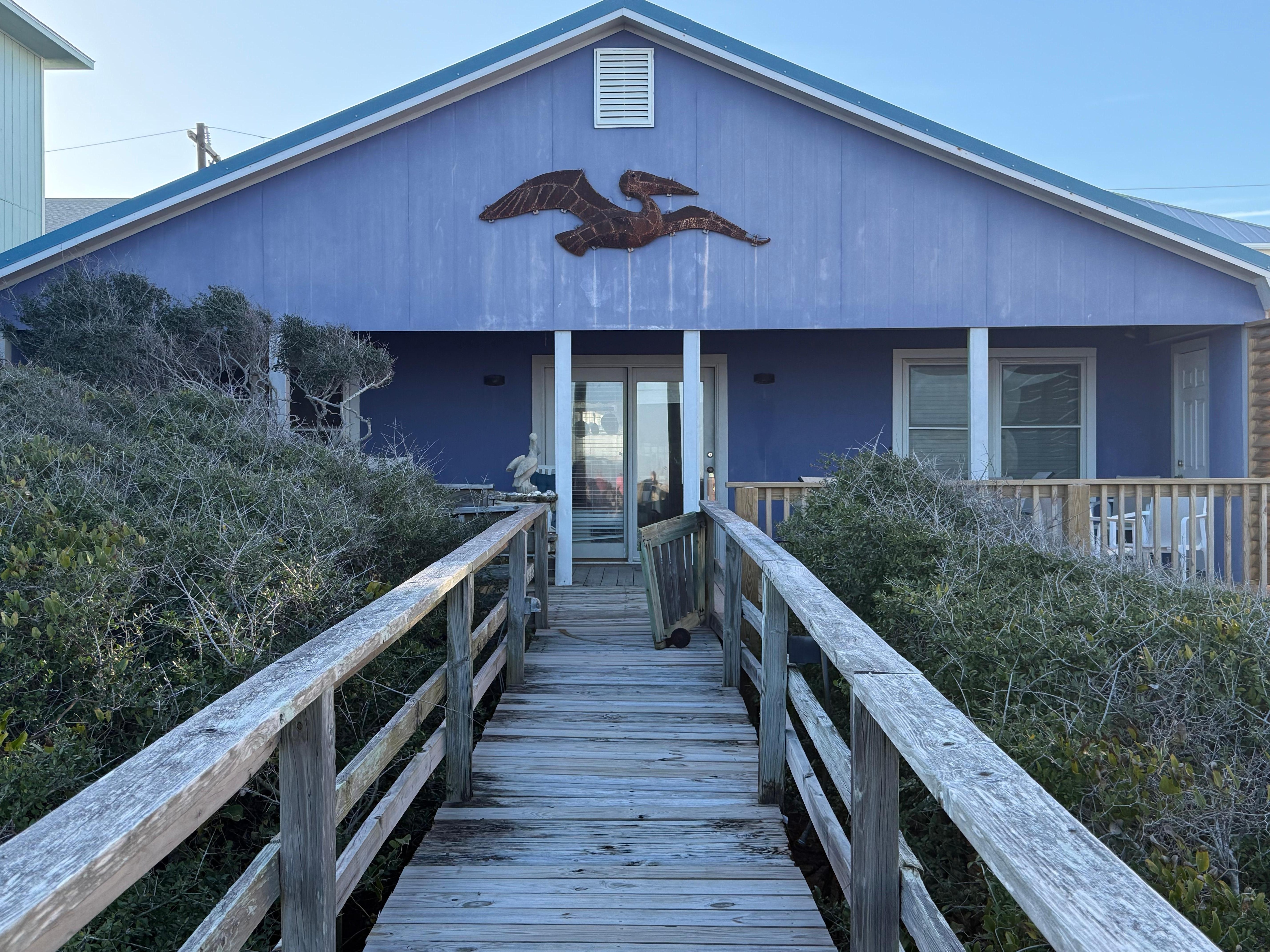 Bring your furry friends because Dogs are Allowed at the Purple Pelican, an Oceanfront single-family home much beloved by long-time residents of Carolina Beach. You will be nestled into a one-way street close to the Carolina Beach Farmer’s Market, Carolina Lake, and Veggie Wagon. Enjoy raucous family time or quiet privacy undisturbed in your covered porch with a private sunken hot tub, and a private boardwalk to the beach. This quintessential floorplan features a great room with four corner bedrooms and two jack n' jill bathrooms. Make your vacation simple, homey, cozy, and directly focused on the beach. Feel free to bring Grandparents, or recuperate from surgery here at the ocean: our front porch has a lift elevator! Take an easy stroll down the beach to the Carolina Beach Boardwalk. Enjoy the front-seat view of weekly fireworks from our raised benches in the dunes. If you are staying in, cook in our fully equipped kitchen. The whole family will enjoy our games and puzzles; and children’s toys and books. You'll want to make this your forever vacation home: Purple Pelican is one of the last few remaining private beach cottages on the oceanfront at Carolina Beach, just waiting to make you part of the family!