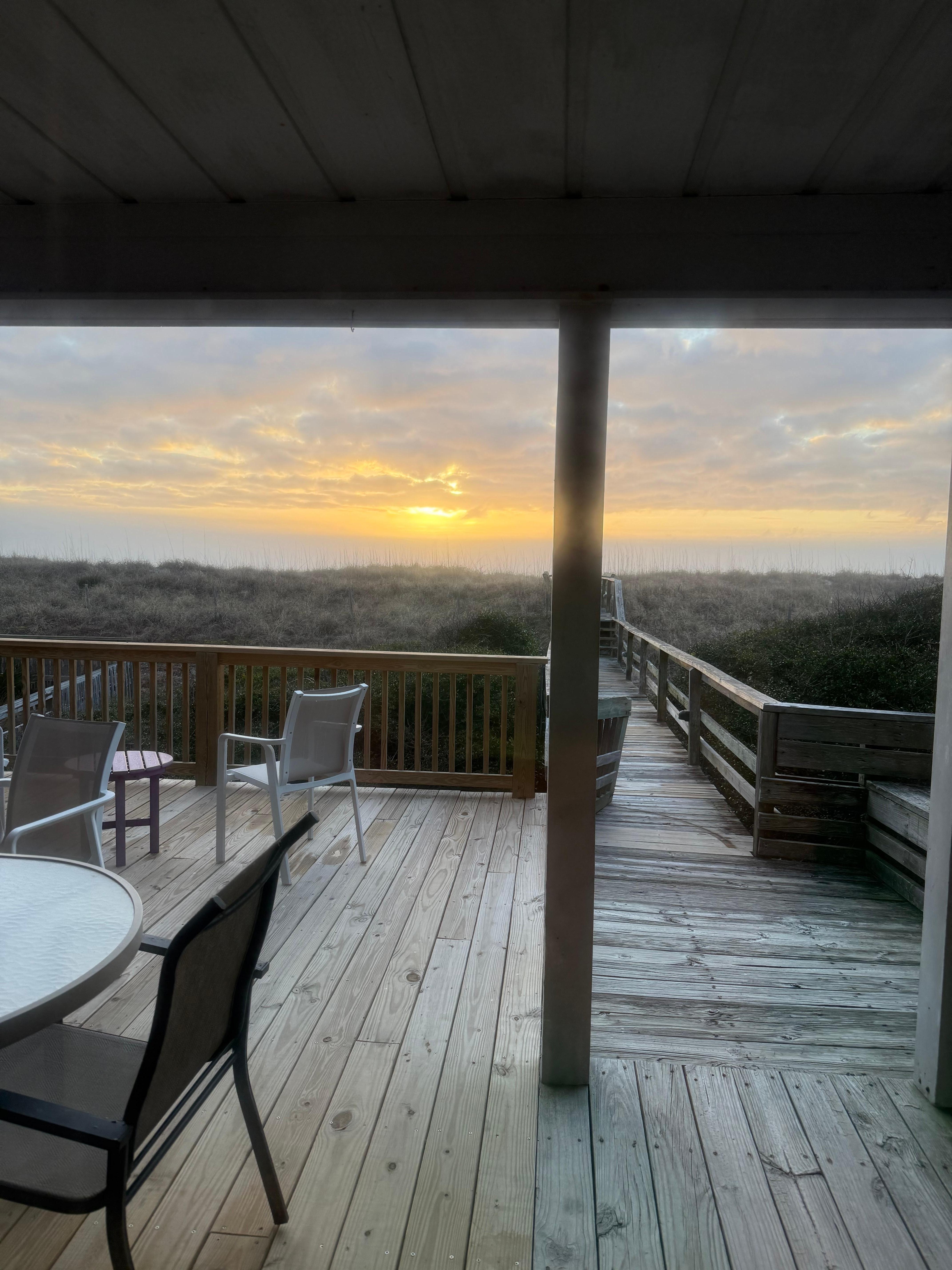 Covered Porch: Rocking Chairs with Cushions, Drink Table, Outdoor Dining table Seating Six, Bench Seating surrounding porch, Sunken Hot Tub, Outdoor Shower, Boardwalk to Beach, More bench seating out at the dunes