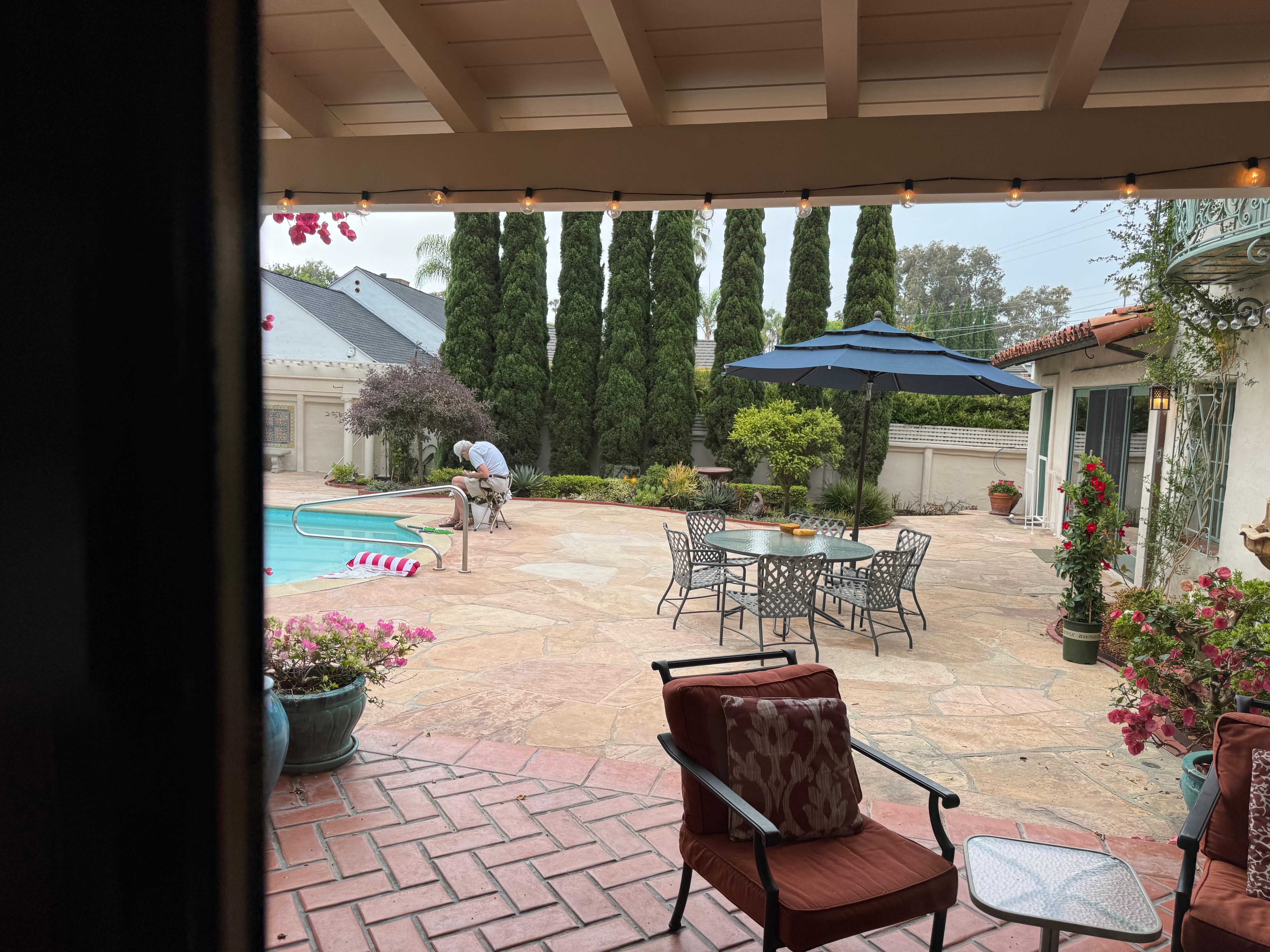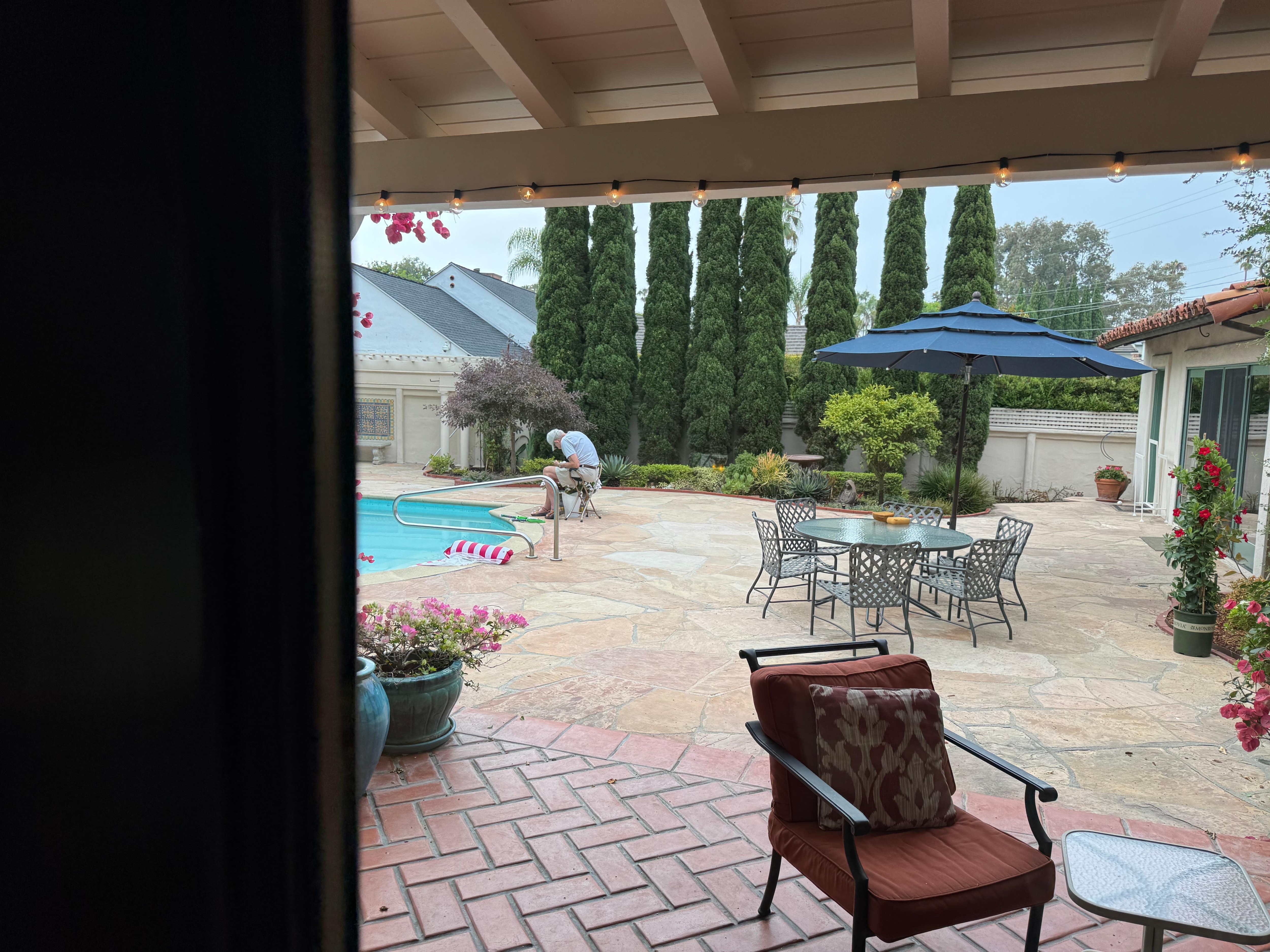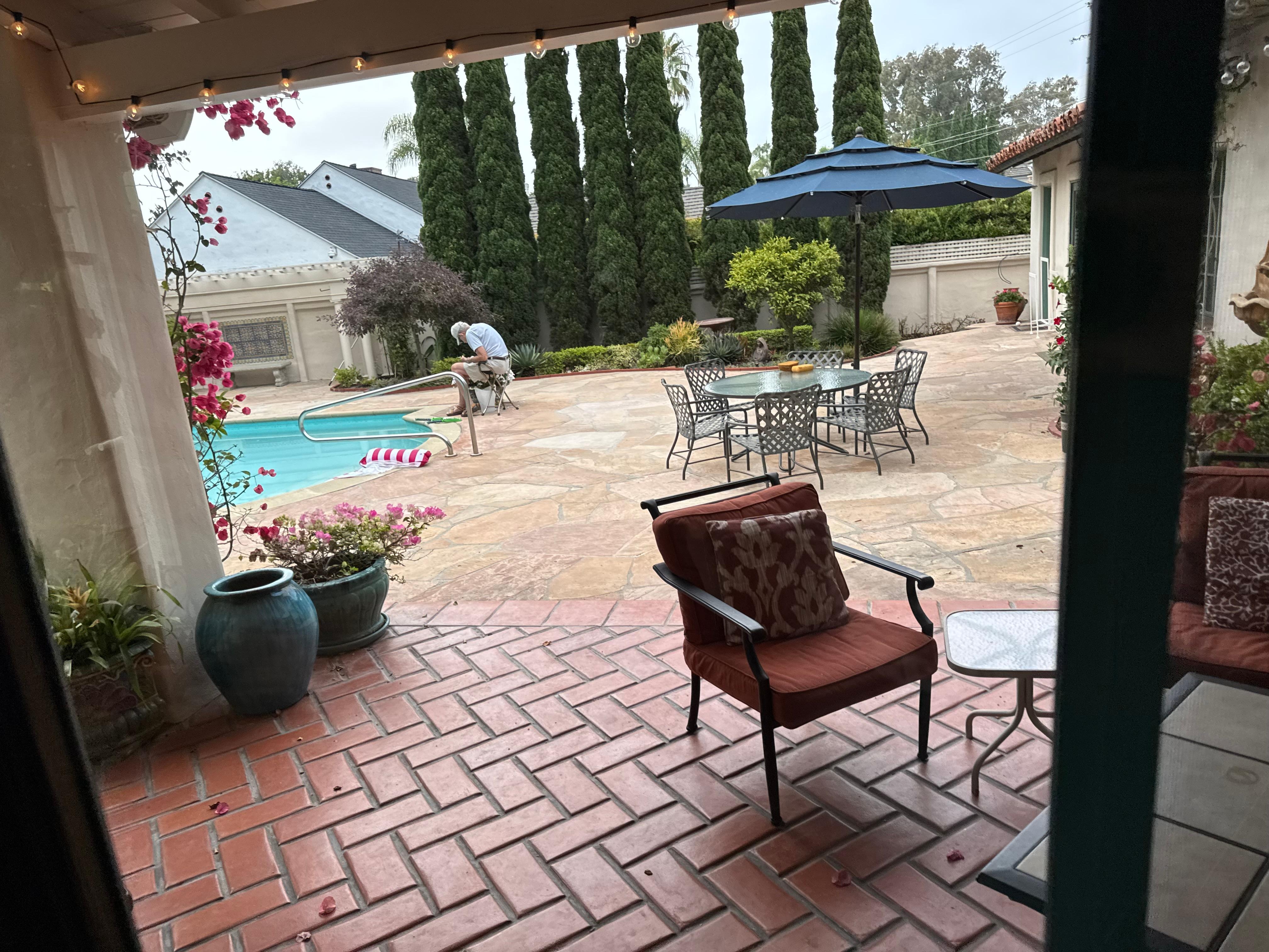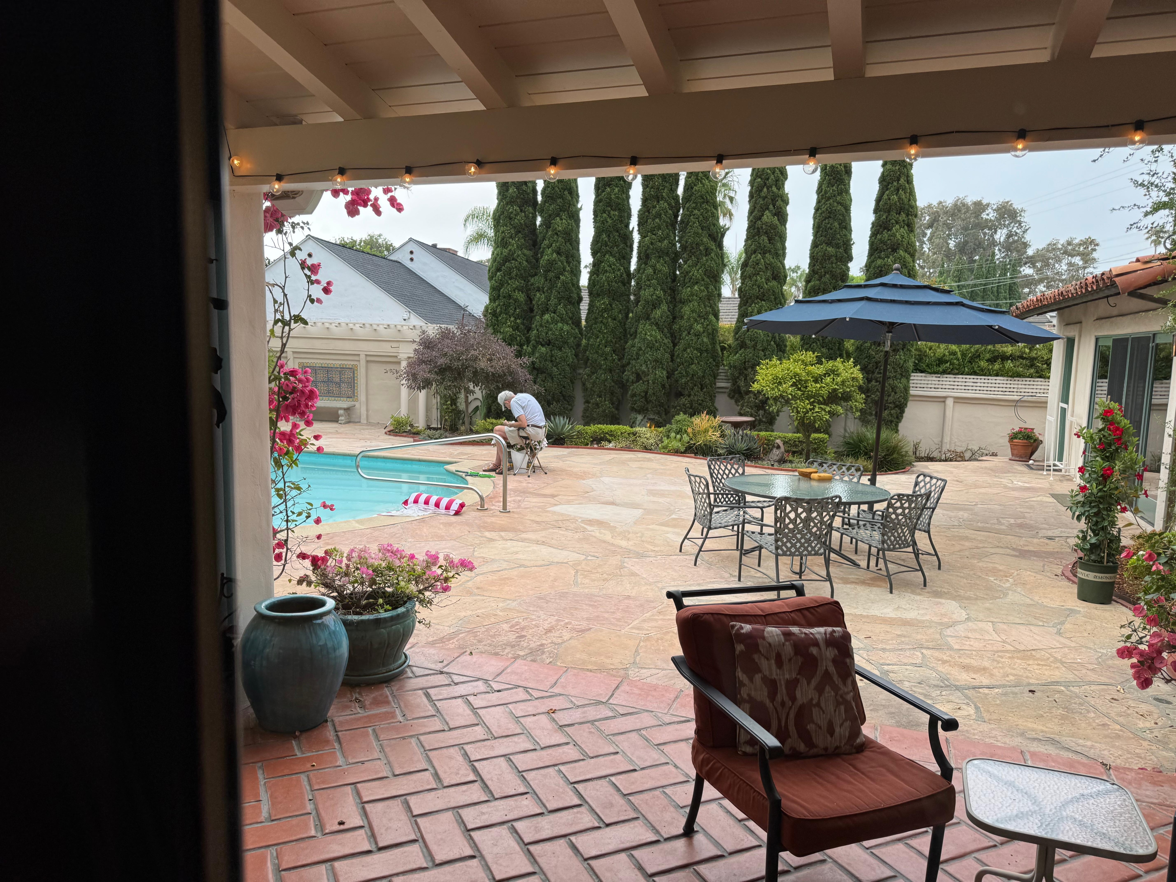 Rodeada por una pared y árboles altos de 60 ’y un jardín, la piscina tiene aproximadamente 25 pies de largo y 9 pies de profundidad en el extremo profundo.