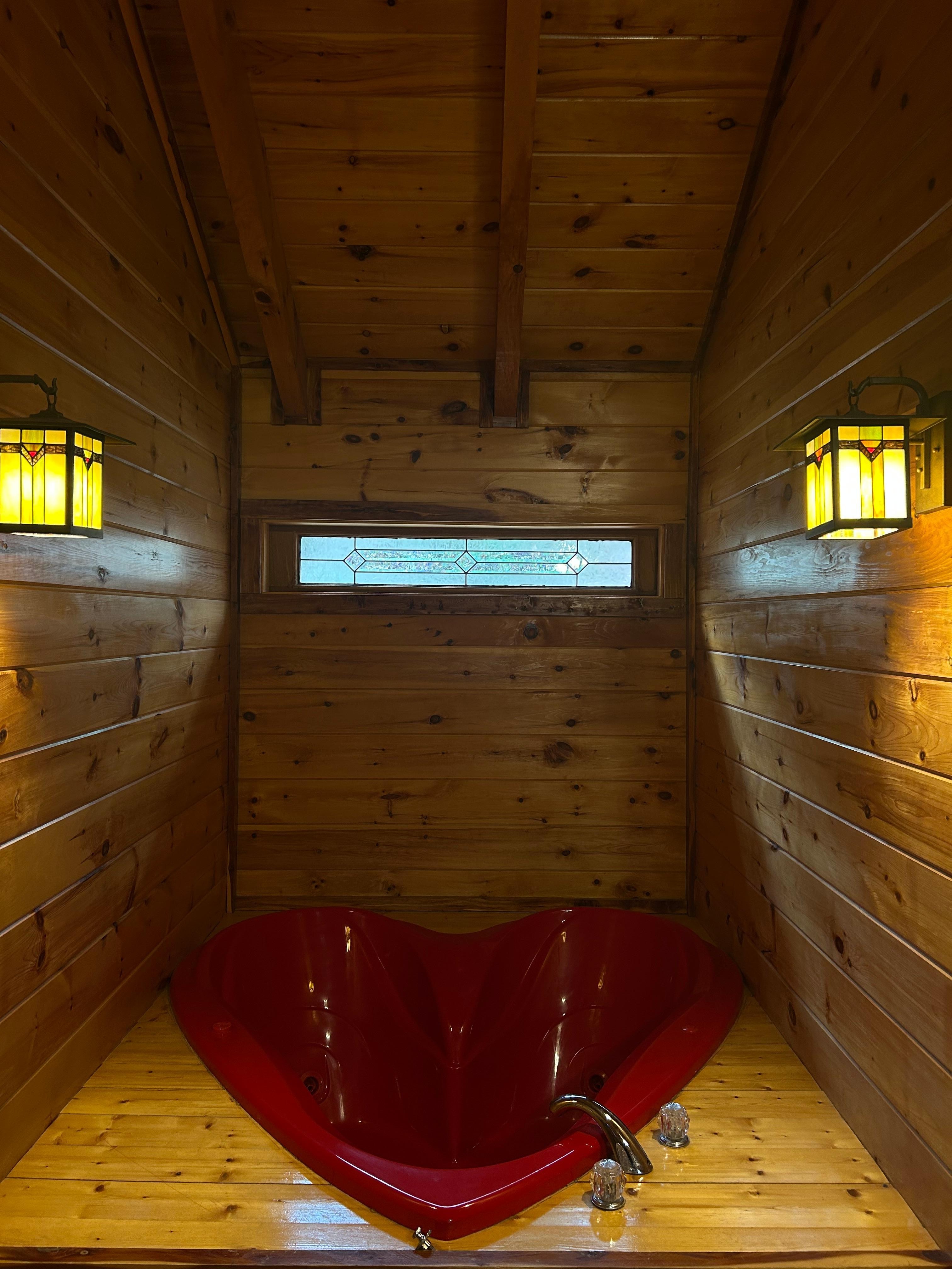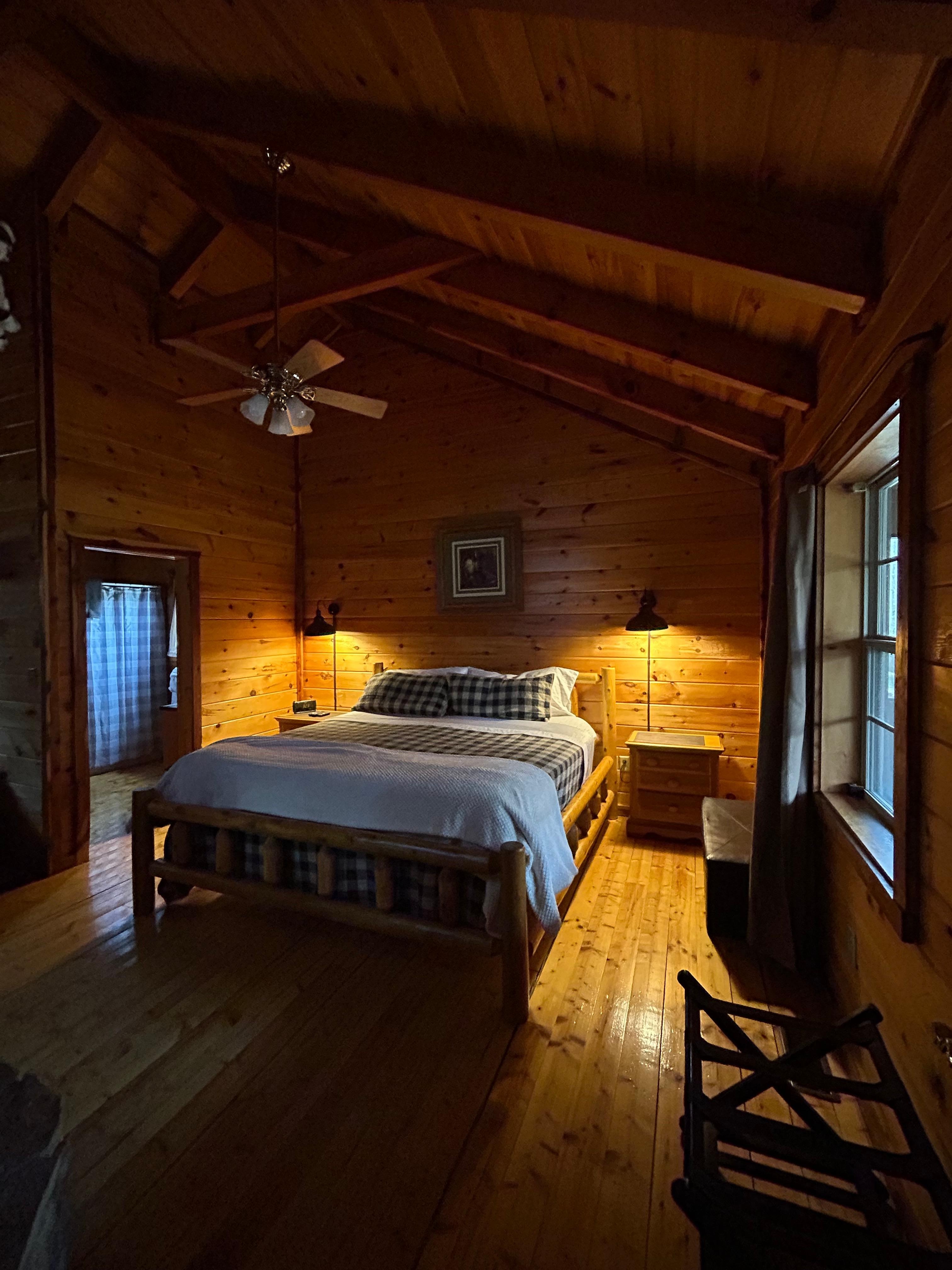 This pet-friendly log cabin may be a fisherman's paradise outside, but inside it's all about creature comforts. Beautiful vaulted wood ceilings keep this 792 square foot cabin feeling spacious. The king bedroom offers a new mattress, double sided fireplace (available Oct 1-April 1), 25-inch TV and heart shaped jacuzzi. The attached bathroom has a generous walk-in shower.