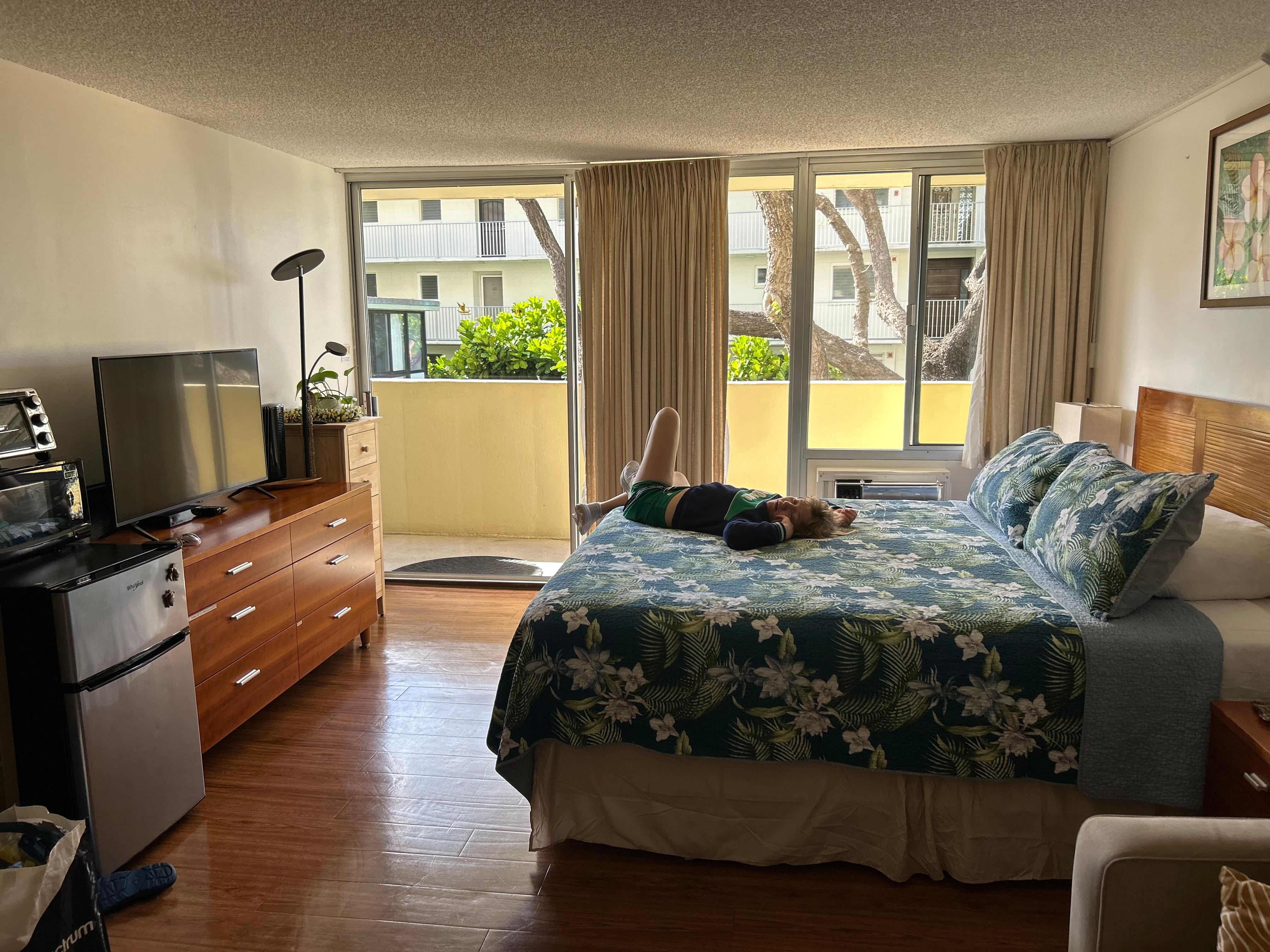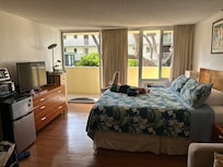 Studio with lots of natural light and cool ocean breezes. This unit has a private lanai, great for enjoying your morning coffee or afternoon tea, and has a great view of Diamond Head, Kapiolani Park and across-the-street water fountain.
