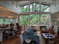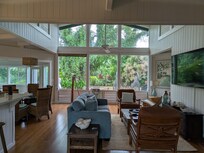 La guarida está envuelta en ventanas y conduce a la amplia terraza. La cocina está totalmente equipada con una estufa, refrigerador de dos puertas, espacio para despensa, microondas y lavaplatos. El dormitorio principal se encuentra en la parte posterior de la casa, tiene una cama king con ropa de cama de lujo, un amplio armario, baño privado y una hermosa vista del patio trasero. Al lado del maestro es el baño de la sala con dos lavabos y una bañera con ducha. También hay un dormitorio de invitados con una cama queen en ese ala.