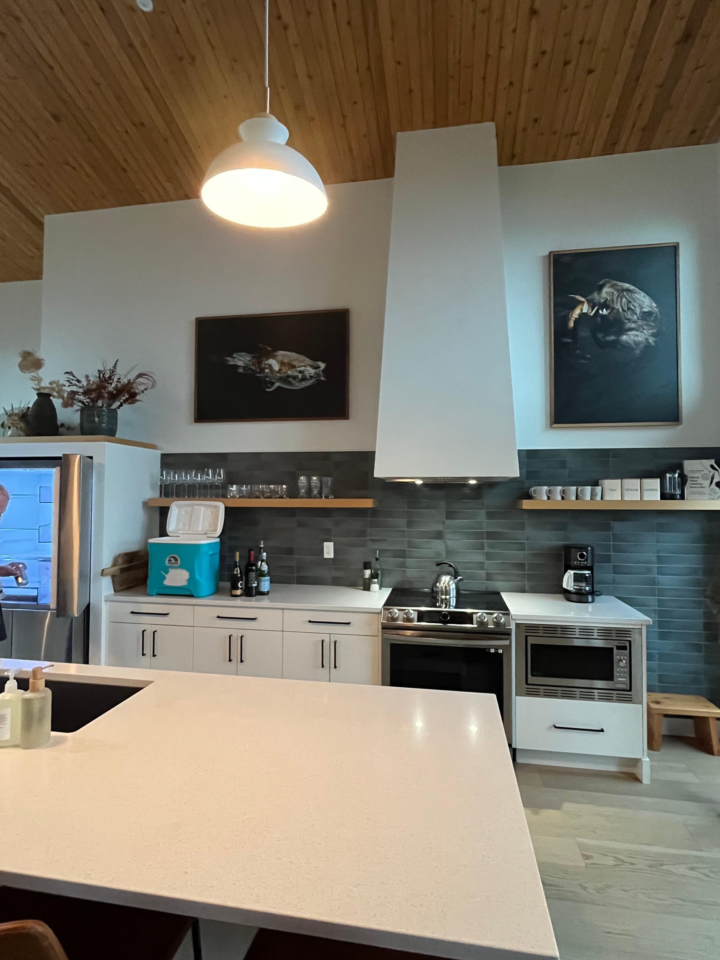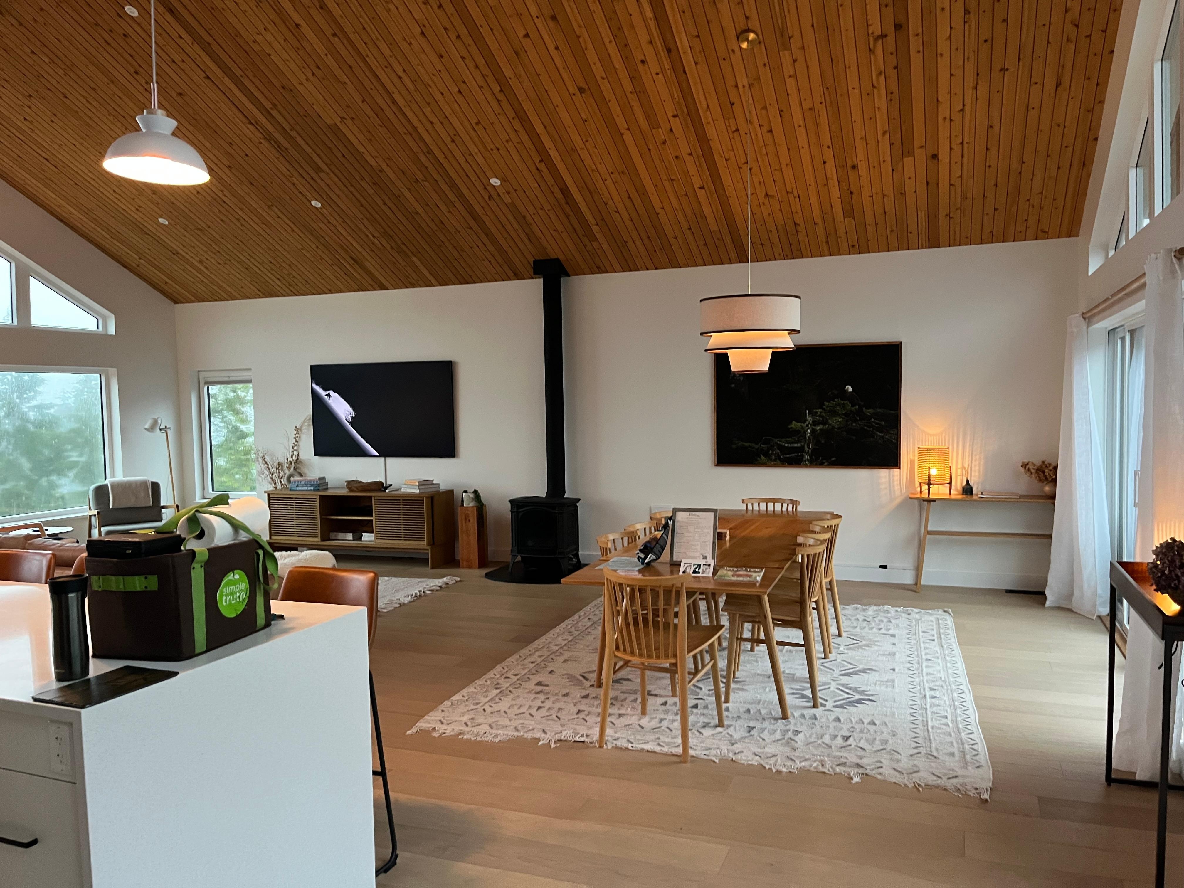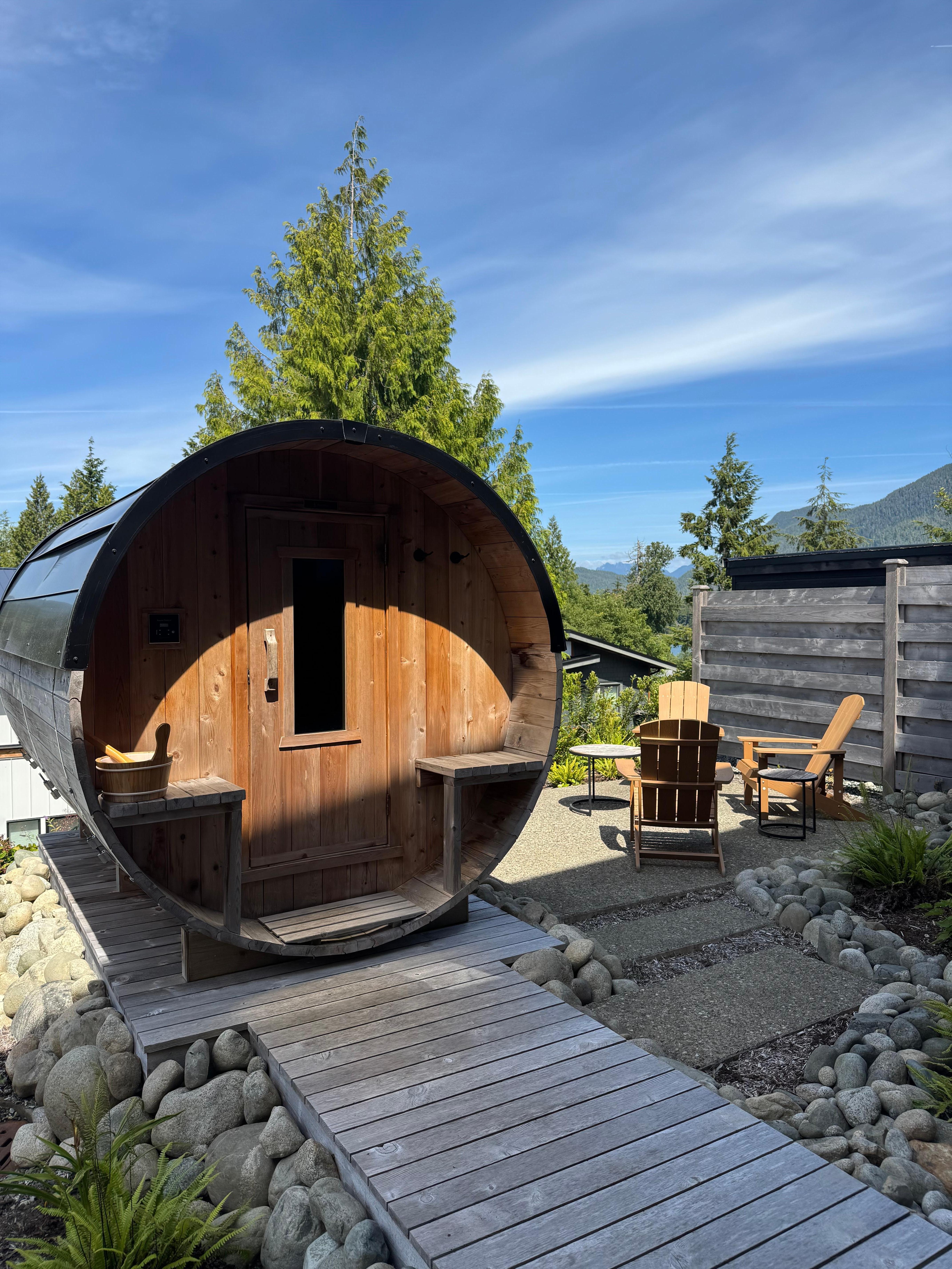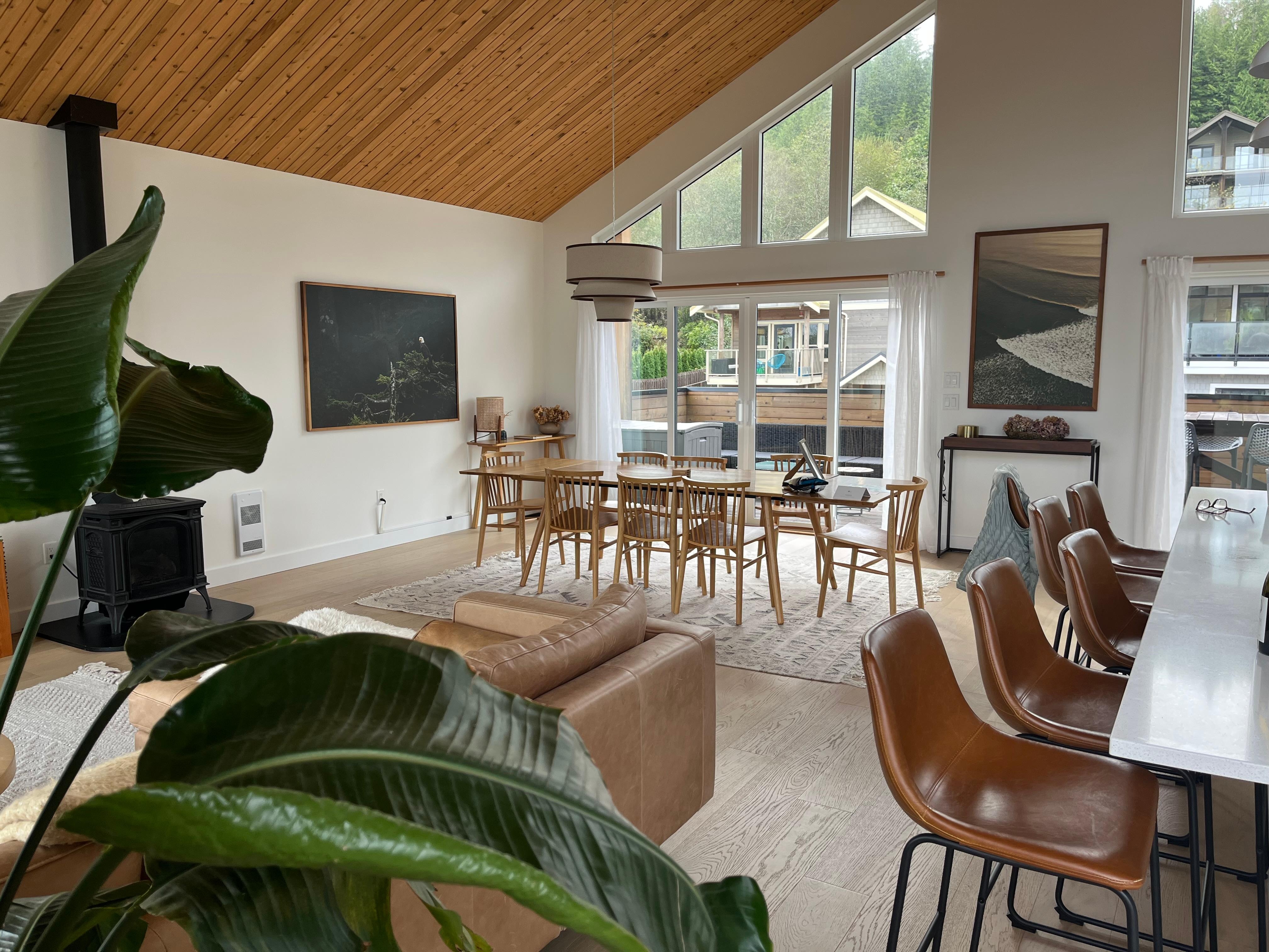 EAGLEWOOD GUESTHOUSE-Come enjoy the luxurious and modern Eaglewood Home in beautiful Tofino! This 3 bedroom/3 bathroom, Scandinavian-style abode offers stunning views of the harbour and mountains, as well as a spa-like back yard and cedar sauna. The upstairs master bedroom has an ensuite bathroom with a shower and separate bathtub, perfect for unwinding after a day of exploring. The great room has an open concept kitchen, dining, and living room with a 70" TV, perfect for cozy conversations and creating memories. Enjoy two decks on the upper floor, including a large south deck with BBQ, and high-top bar on the north deck with views of the harbour and mountains. The lower level has 2 king bedrooms with a shared bathroom. After a day at the beach, warm up in the barrel cedar sauna and then rinse off in the outdoor shower. The village, beach, coffee shops, and restaurants are all within walking distance for your convenience. Don't miss out on this luxurious stay in Tofino -- Eaglewood Home will not disappoint!