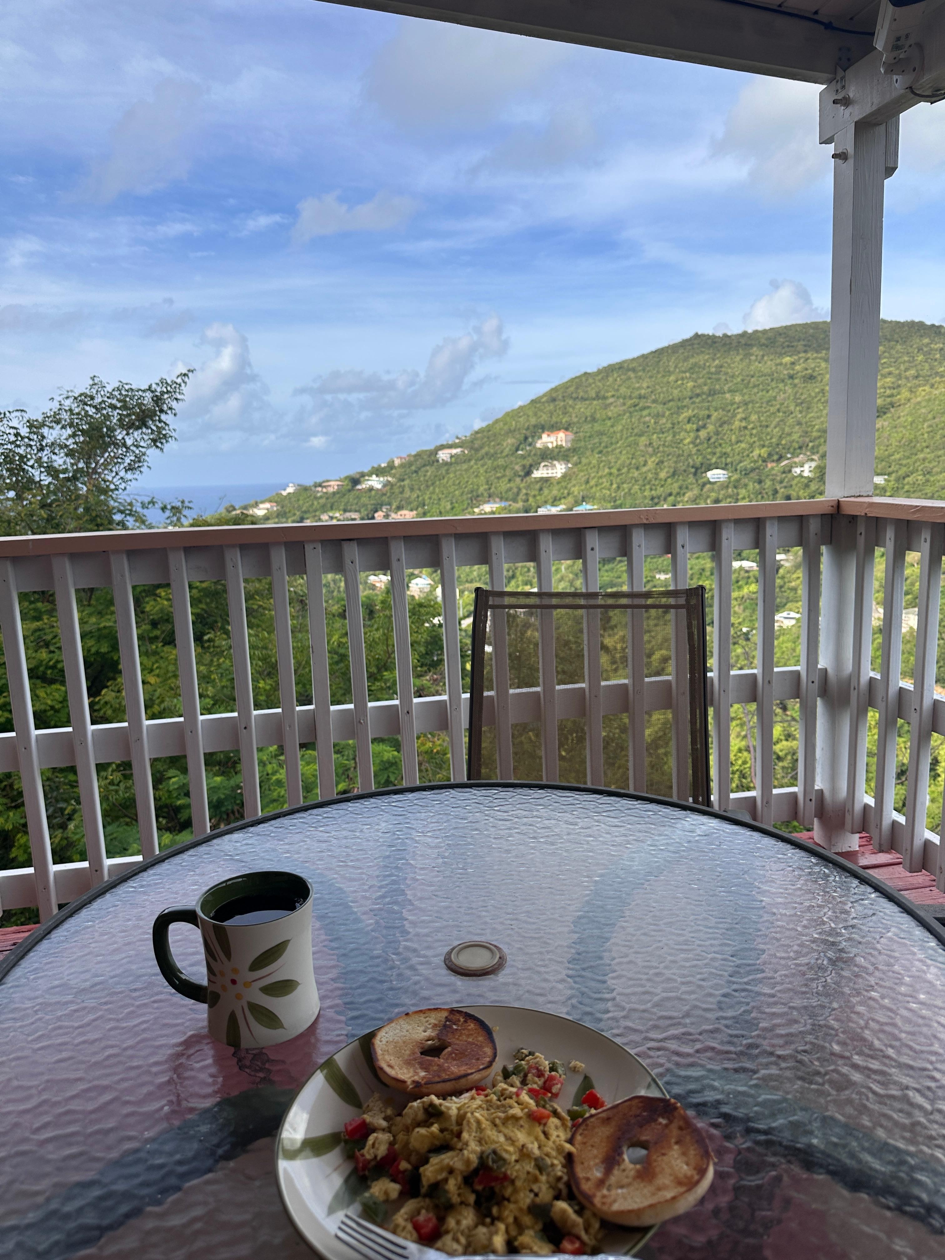 “Pine Cone Drive” is a beautifully cozy and comfortable West Indies style home located in quiet Skytop, Fish Bay St John. The six very large concrete Pine Cones that sit on the right side of the driveway inspired the house name. The house offers a very airy & open view to our majestic mountains and lowly valley. It also provides an average ocean view on the west side. One can sit in the covered deck and just enjoy the boats pass by. Occasionally, even a cruise ship can be seen. The house has a full kitchen, living and indoor dining area, open dining at the covered deck and full laundry. For the BBQ Master enthusiast, take command of the BBQ coop at the front yard. There is a Generac generator on site so customer is not left in the dark during power outages.