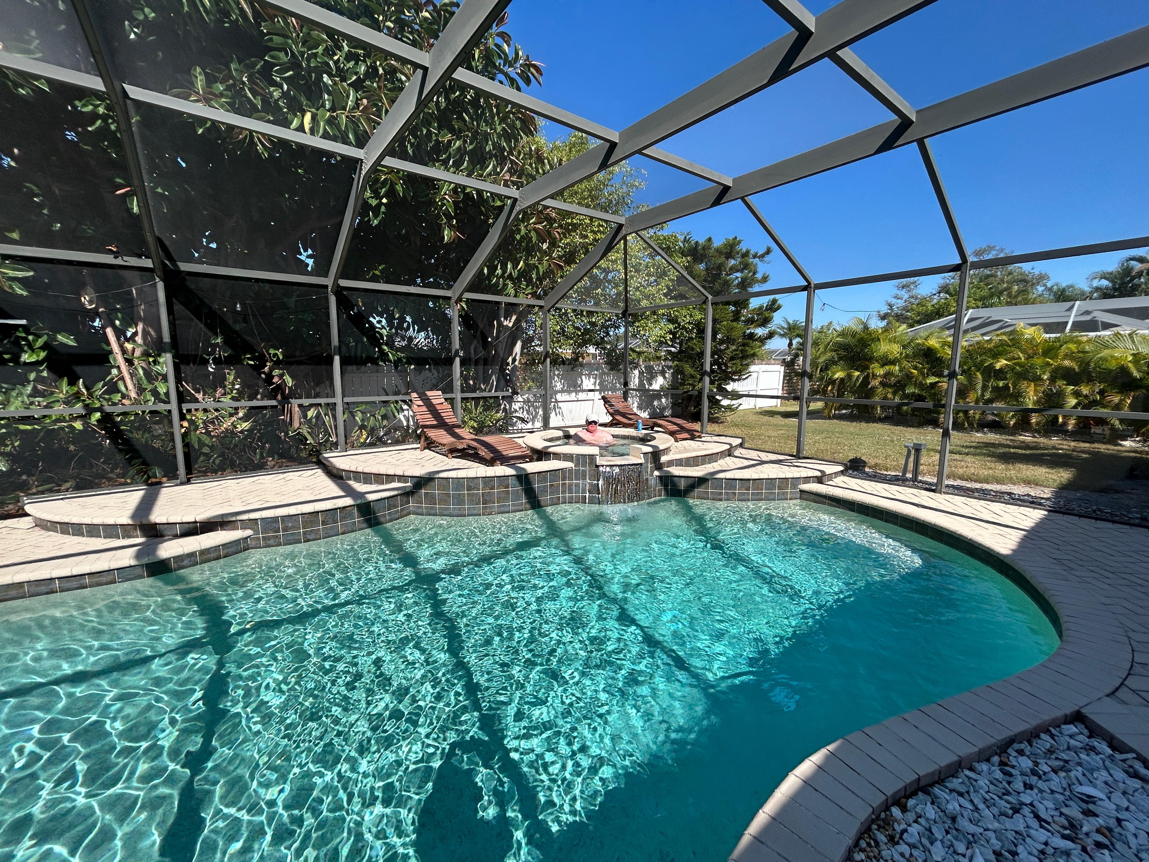 The entire property including the 2-bedroom 1-Florida room 2-bathroom house with a nice fully equipped kitchen, 2 car garage, 2 car driveway, a large yard and fully fenced in big pool with a beautiful water feature is for the guests to enjoy.