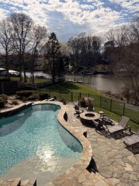 Upon stepping outside, you will find yourself transported to a backyard paradise! The pool is oh-so inviting. With a perfect view of the lake, it features two waterfalls, a sunning deck with an umbrella, and chaise lounges with a couch and tables to spend your day. The pool area is fenced to keep the kiddos and Fidos safe and close by.