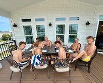This stunning brand-new home for 2024 has views of the intracoastal waterway and is only a short walk to the beach! Your family will make many fond memories in this luxury 5 bedroom, 5 ½ bathroom home. The top floor features a large, open floor plan great room adjacent to the brand new, well-equipped gourmet kitchen. The middle floor will host a family game night of your dreams in the gameroom with wet bar, featuring arcade games and shuffleboard. In addition, the ground floor features an enormous outdoor living space by the pool and hot tub, including The Salty Dog Tiki Bar, gas grill, outdoor ping pong table, pool basketball, pool volleyball, cornhole, pool toys, etc.... The kitchen dining area easily accommodates 12, with 8 at the dining table and 4 bar stools at the kitchen island. An additional 8 can be seated at the cast aluminum outdoor dining table on the large deck outside of the kitchen.