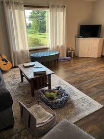 Two bedrooms, each with queen beds, plus a pull-out couch in the living room to sleep 6. One floor rancher with a lot of open space, recently renovated. Roku smart tv's in both bedrooms and living room. Fully stocked kitchen for cooking. Sheets and bath towels provided. Paper towels, toilet paper, bath soaps and shampoo also provided. The fireplace is decorative and is non-wood burning. No smoking in home.