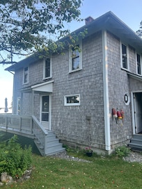 Rock Holme - This is a private oceanfront house set on a point at the tip of the town of Bernard with views of Bass Harbor and outer islands. It has a large painted deck with chaise chairs, anti-gravity chairs, dining furniture, and large gas barbecue grill. The private beach is accessible from the front yard and through a short woods path over a quaint bridge and short walk trough our woods path. The beach through the woods has large stones to sunbath on, and picnic on and there is an island that appears on our beach at low tide. It's a great place to explore and for evening cocktails as the sun sets. There is some beach sand that occurs on our beach at low tide and a nice soft public sand beach to the right of the property around the corner at low tide within walking distance. The ocean sand area is fun to explore to find hermit crabs. Our front beach is ideal to launch kayaks and to beach comb.