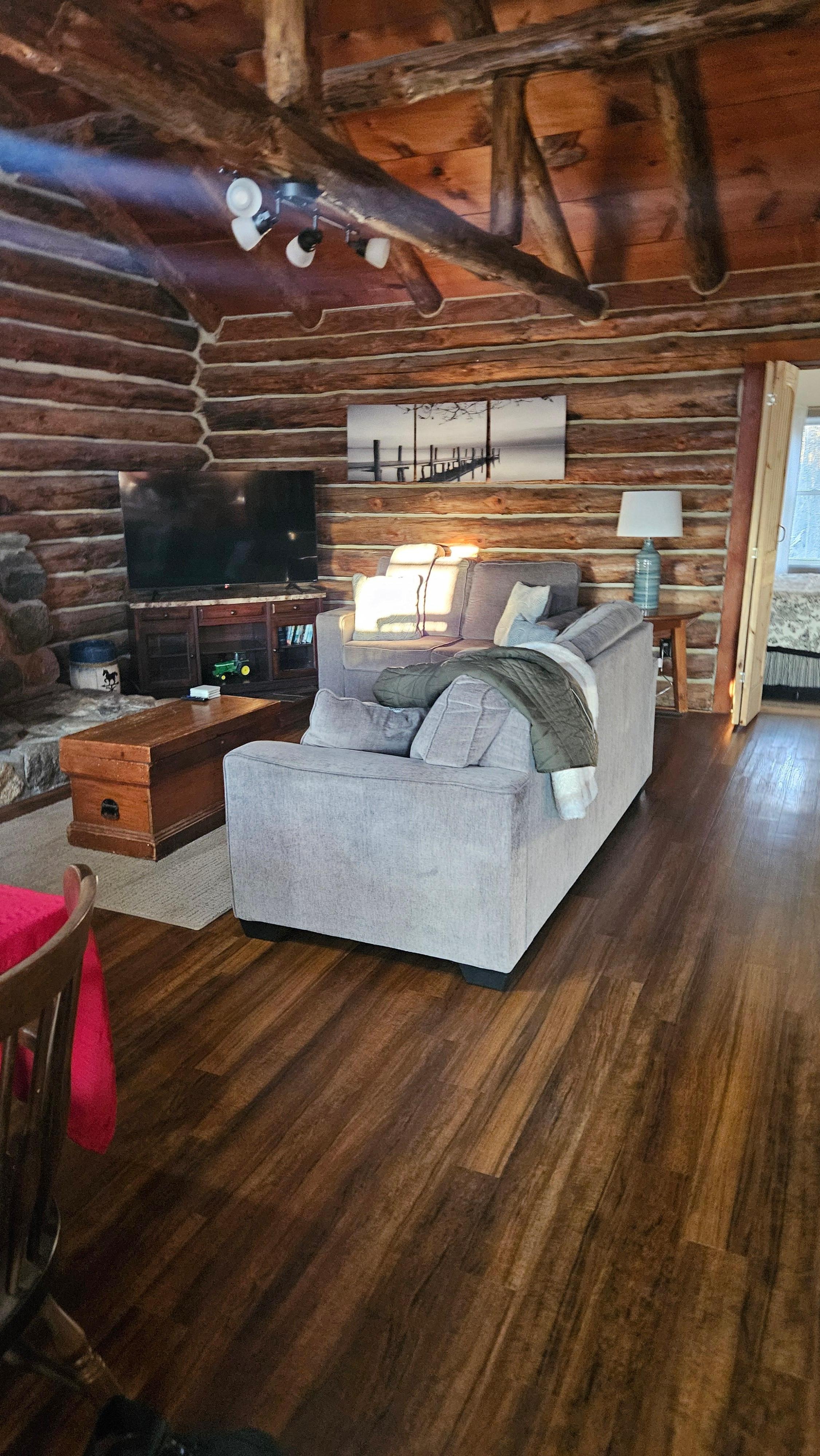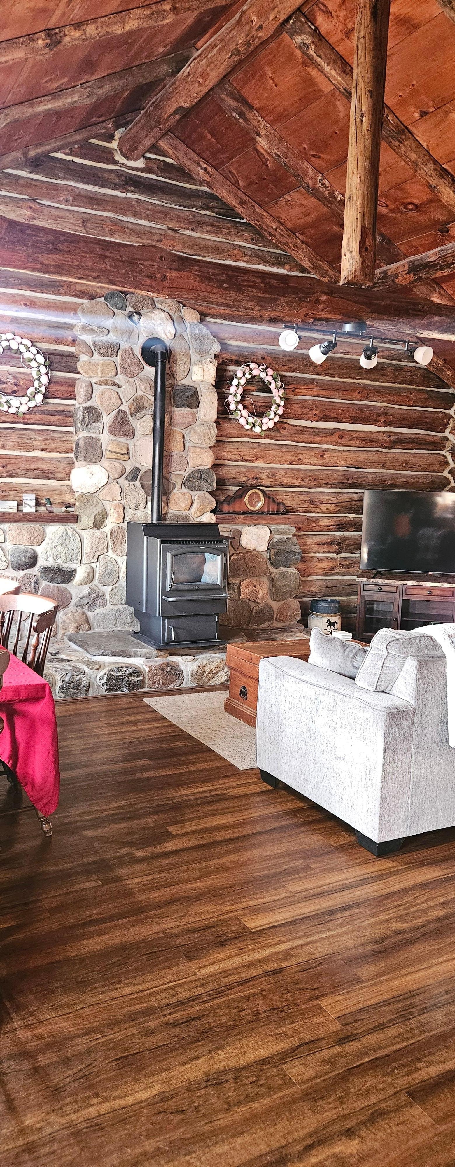 Take a relaxing soak in the hot tub before you cozy up for the evening in front of the toasty pellet stove! Enjoy the rustic cabin feel intertwined with a few luxuries. The Cabin's main floor is open concept with dining space, living room area and full kitchen. The spacious master bedroom has a queen size bed, large closet and flat screen tv. It is possible to close this space off completely from the rest of the living area. You'll get the true cabin feel in the upstairs loft which features a double bed. This is a true loft space with low ceiling clearance at 5'6" at the peak. Perfect for kiddos or an able couple. The living room area has a brand new queen size, pull out bed for added sleeping space.Relax with your morning coffee or glass of wine in the evening while you watch the horses graze in the front pasture. Before bed, slip into the hot tub for a relaxing soak (the star gazing is AMAZING!) and find out what a GREAT night of sleep feels like! For summer time, public swimming opportunities are a 5 minute drive along with kayak/boat launches.