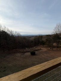 When you walk through the front door, the cabin opens up to the large, open concept kitchen and living room. There is a master bedroom on the right side of the cabin with a king size bed. This room has a gorgeous bathroom, master closet and a balcony. As you walk back through the living space, on the other side of the cabin is the laundry room, another full bathroom and 2 more bedrooms. One bedroom has a queen bed, the other has 2 bunk beds (sleeps 4). If you walk downstairs to the basement it will open up to the pool table, air hockey, and daybed for additional guest to sleep. The room then opens up into the bar area and movie room. If you walk outside upstairs, you will find the new hot tub spa. Enjoy the privacy of being on a private dead-end road, no traffic, keep an eye out for the occasional deer or turkey strolling through the yard!