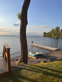OUTDOOR LIVING: Private boat dock, lawn chairs, picnic table, gas grill, outdoor beach shower, inflatable raft, paddle boats, 2 kayaks, fire pit