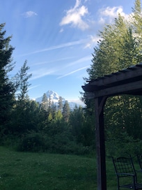 The house sits on 5 wooded acres with stunning views of Mt Hood, and ranch land on both sides. Outside space includes hot tub, brick patio with pergola and seating, large grass lawn. Inside includes a wood burning stove, Amazon Echo music system and TV, both connected to Wi-fi.