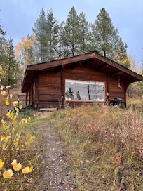 • A simple, comfortable cedar log cabin with a master bedroom, a small bunk-bed room, a comfortable living room/dining room/kitchen area and a small bath with tub and shower