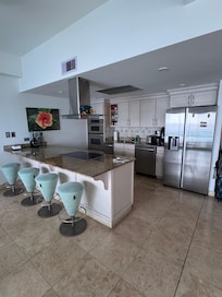 Totalmente equipado, cocina gourmet con todos los lujos de la casa. Encimeras de granito, electrodomésticos de acero inoxidable de lujo con microondas / combo horno, estufa eléctrica con la capilla iluminada de escape, refrigerador grande, triturador de basura, compactador de basura, en el fregadero aireador / triturador, cafetera, tostadora, licuadora, y completa cocina / utensilios para comer. La mejor parte ... tener las impresionantes vistas del Caribe mientras prepara sus comidas!
