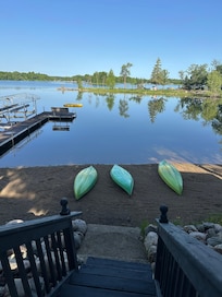 Pull kayaks up on beach next to dock and return paddles to porch.