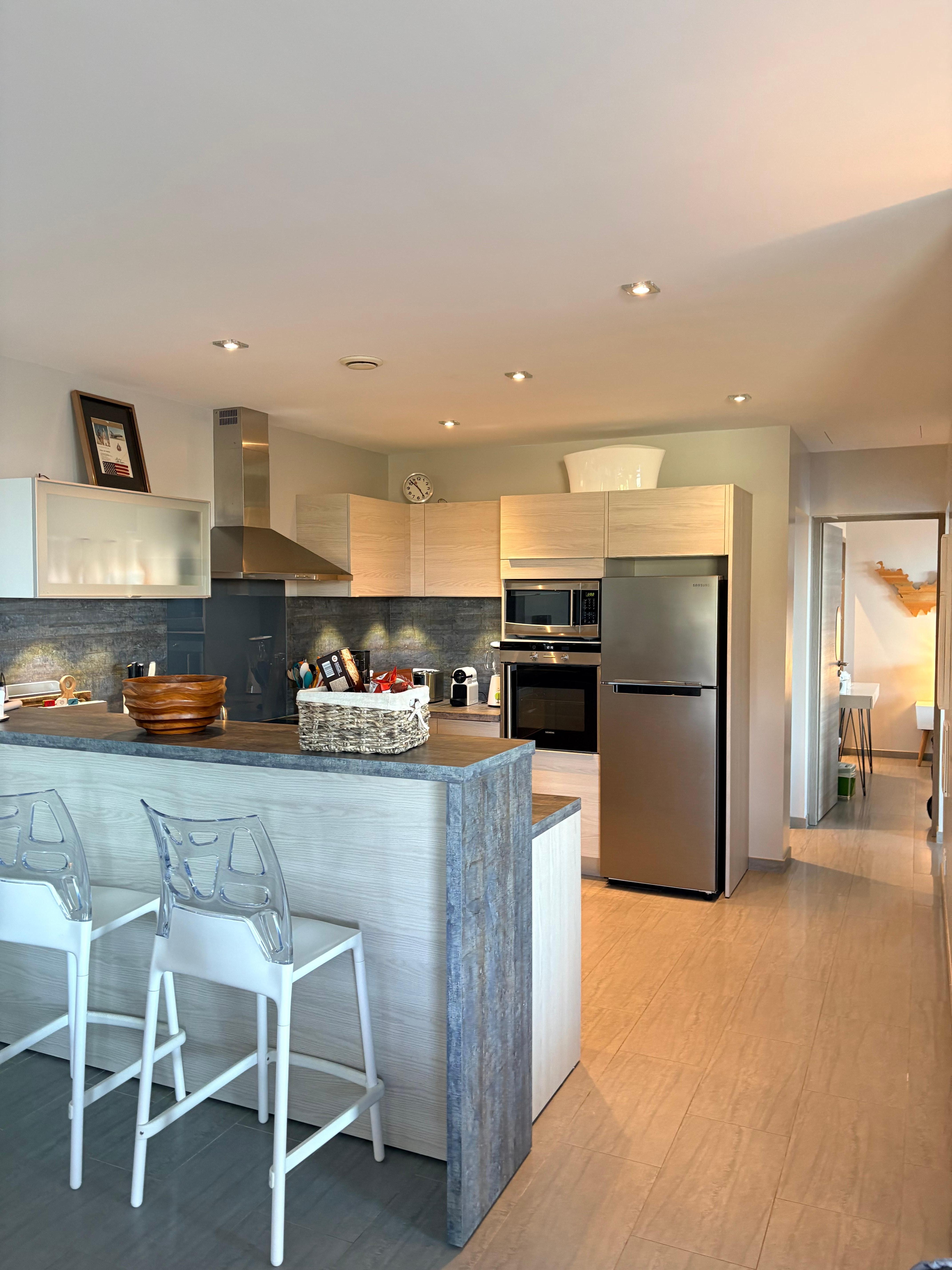 Skræddersyet (sur mesure) køkken og bar fremstillet i Frankrig (Køkken Schmidt). To moderne barkrakker (tabouretter). Opvaskemaskine (Bosch), køleskab, mikroovn, induktionskogeplade (Brandt), ovn (Siemens). Kaffemaskine, Nespresso (Krups; medbring egne kapsler). Primært franske, italienske, tyske, hollandske og danske apparater, værktøjer, tilbehør, køkkengrej, tallerkener, glasvarer til ethvert formål og service. Udstyret af en kok og restaurantejer til at gå ud over det blotte minimum, der findes i de fleste ferieboliger.