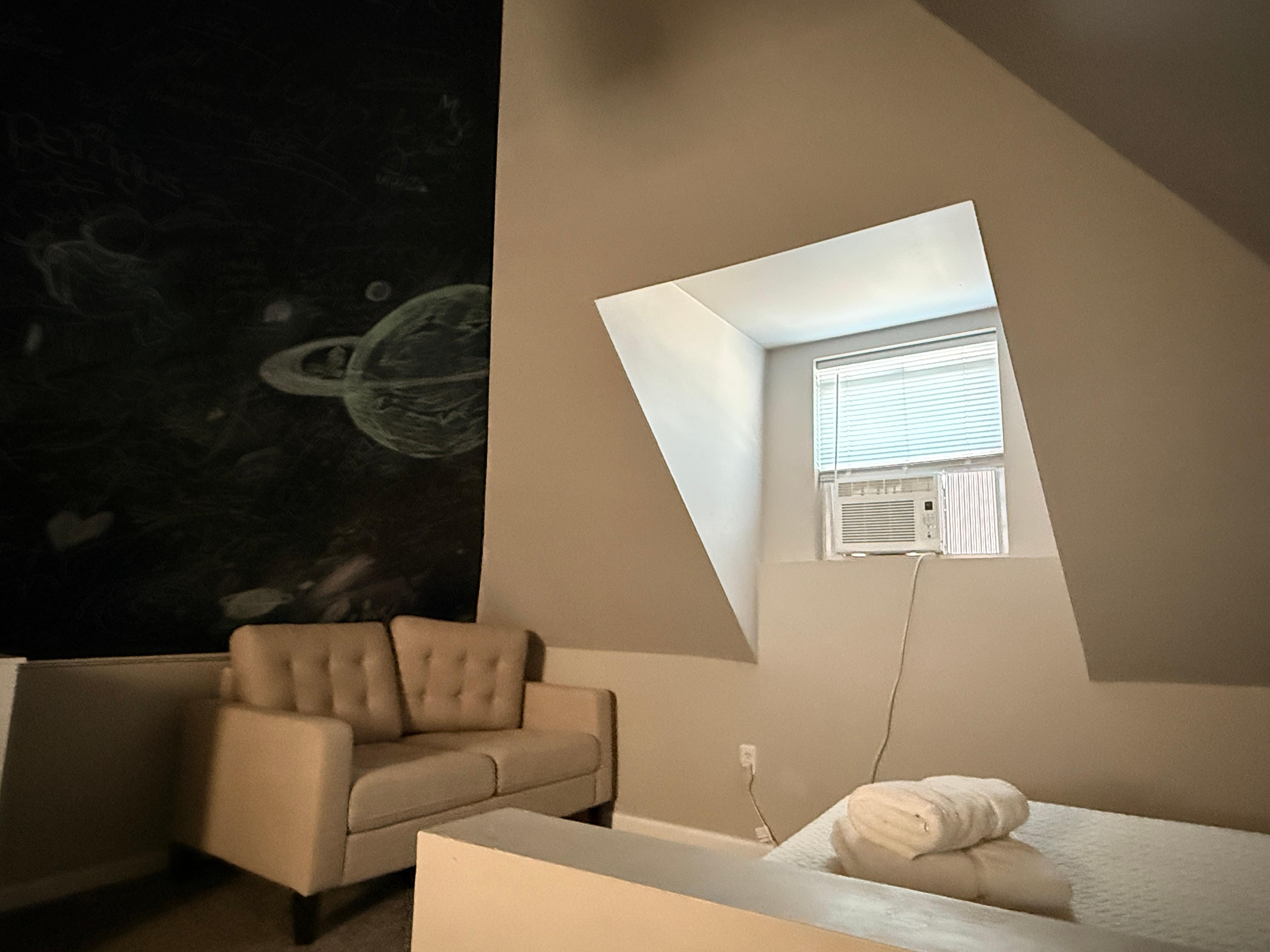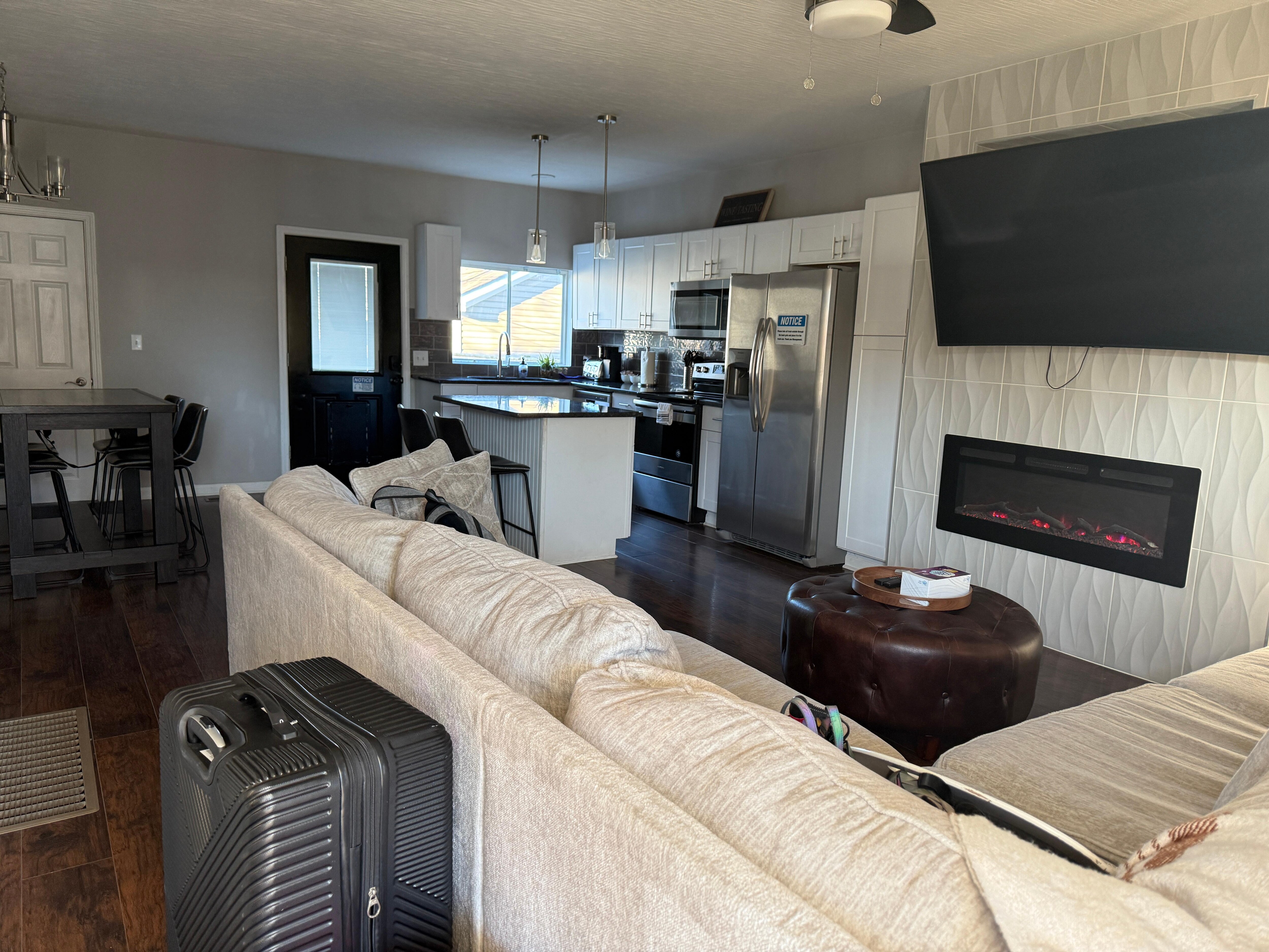 Step inside to find a sleek, modern interior designed for relaxation and connection. The living room welcomes you with a cozy sectional, a fireplace for added ambiance, a smart TV, and a stack of board games ready for a night in. Flow into the stylish kitchen, where dark stone countertops, stainless steel appliances, and a Keurig invite you to whip up your favorite meals or morning brew. Pull up a stool at the counter for a quick bite, or gather around the dining table for four to enjoy a more leisurely meal.