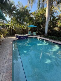 What truly sets this cottage apart is the very private tropical garden oasis just outside your door. Surrounded by Florida native plants, you'll feel like you’ve stepped into your own secluded paradise. Enjoy the sparkling pool and non-jetted spa for a refreshing dip or evening soak.