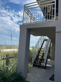 Our condo is two stories. Stairs are inside the unit. An elevator is located at the west end of the building and allows access to both floors without having to take the stairs.