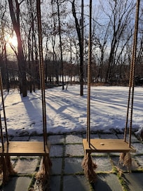 • Private hot tub with a peaceful wooded view